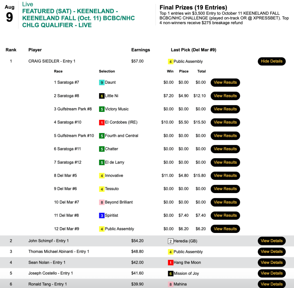Craig Siedler (3 firsts, 2 seconds) departed with the $3,500 seat in his pocket when Saturday’s Keeneland Fall BCBC-NHC Challenge qualifier was said and done.