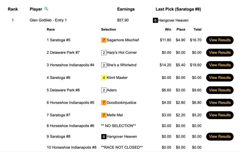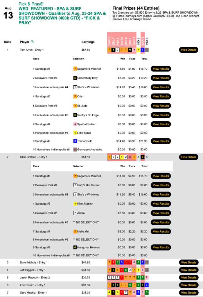 In the Live-format cash tourney, Gottlieb (and the others) didn’t need to make a pick for the 6th and 8th at Horseshoe Indy because that track canceled its remaining races due to weather after race 5. The Spa & Surf Showdown qualifier, however, was a Pick & Pray. When selections were due for it, Gottlieb couldn’t have known that Horseshoe Indy wasn’t going to finish its card. Yet he didn’t make a pick for races 6 and 8 at Indy…or for race 5 at Indy, for that matter—a race that was, indeed, run. Nonetheless, Gottlieb won his seat, making the mistake a lot easier to laugh off than it otherwise might have been.