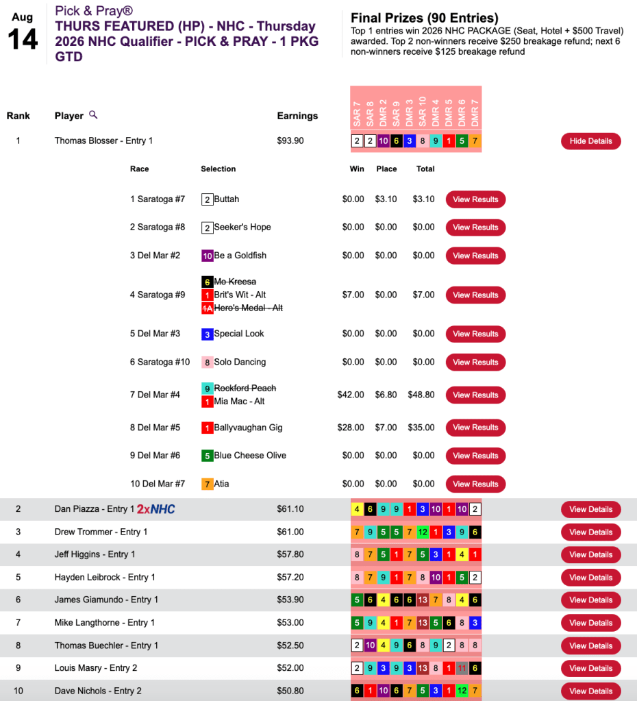 Blosser (3 firsts, 1 second) punched his ticket to Vegas in Thursday’s $125 NHC qualifier at HorsePlayers. Dan Piazza, trying to keep himself sharp for his title defense in seven months, came in second.