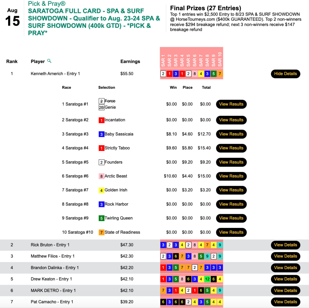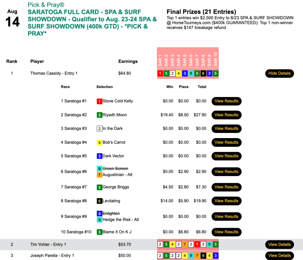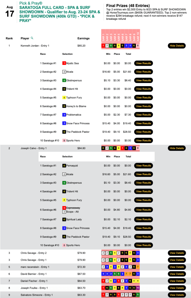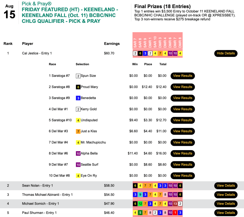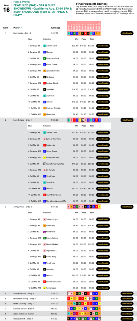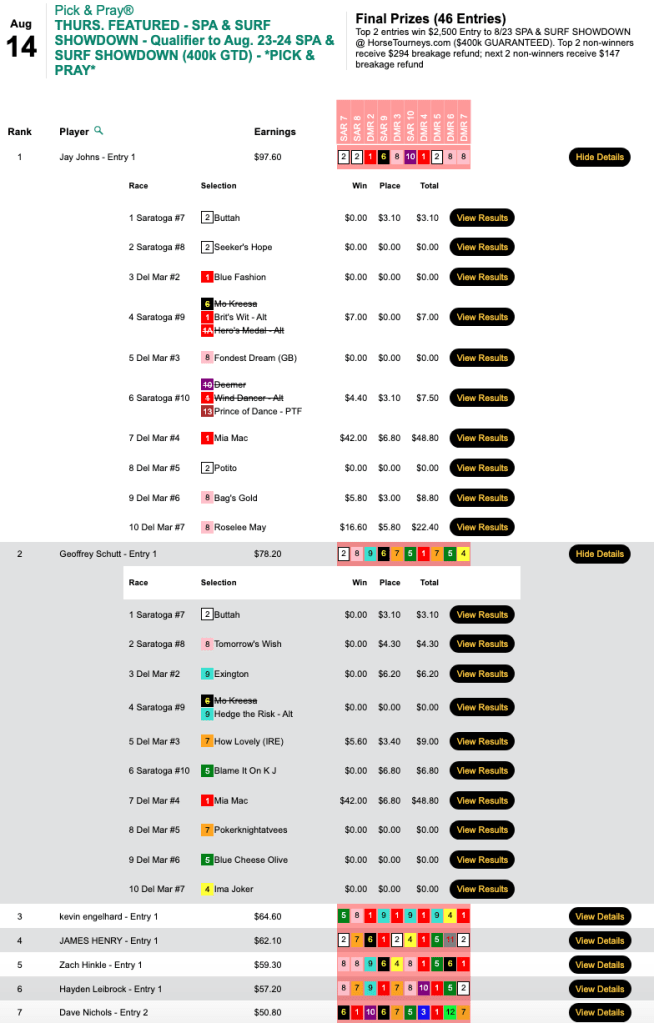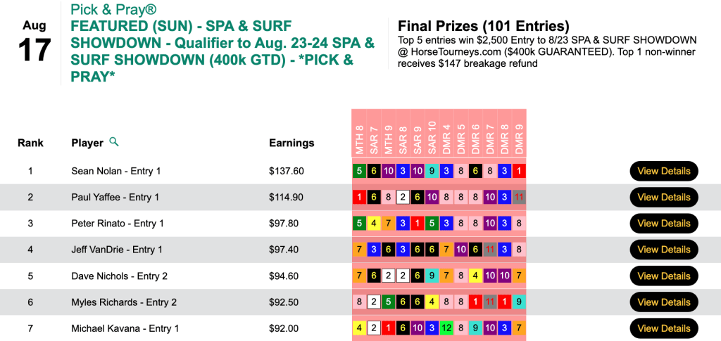 Speaking of the Spa & Surf Showdown, it’s taking place this Saturday and Sunday. Players must make selections (Live format) on every race at Saratoga and Del Mar on each day. Qualifiers continue here through Friday, and buy-ins ($2,500 entry fee) will be accepted right up until first post at Saratoga on Saturday. Note that post time at Saratoga on Saturday (Travers Day) is early—11:10 am ET!