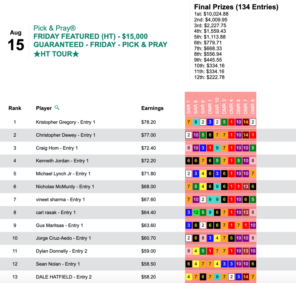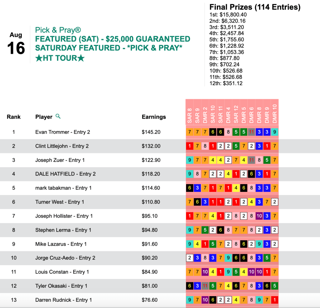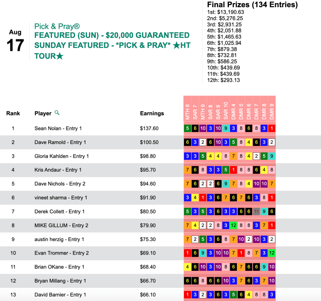 Nolan’s frequent—and frequently gaudy—hits got him the top prize of $13,190 in Sunday’s HT Tour battle, our $20,000 Gtd. Pick & Pray, which ultimately paid out a total of $29,312.