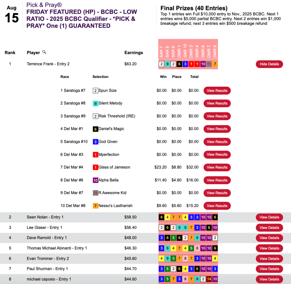 Frank exited with the $10,000 seat in Friday’s Low Ratio qualifier to the Breeders’ Cup Betting Challenge. Sunday hero Sean Nolan perhaps foreshadowed what was to come by ending up in second place—which was good for a $5,000 partial BCBC entry.