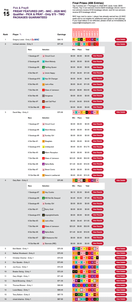 There was also a $500 Low Ratio NHC qualifier at HorsePlayers on Saturday.
