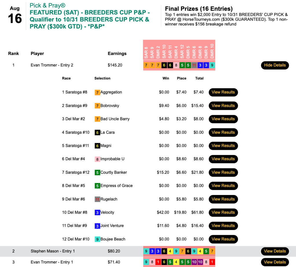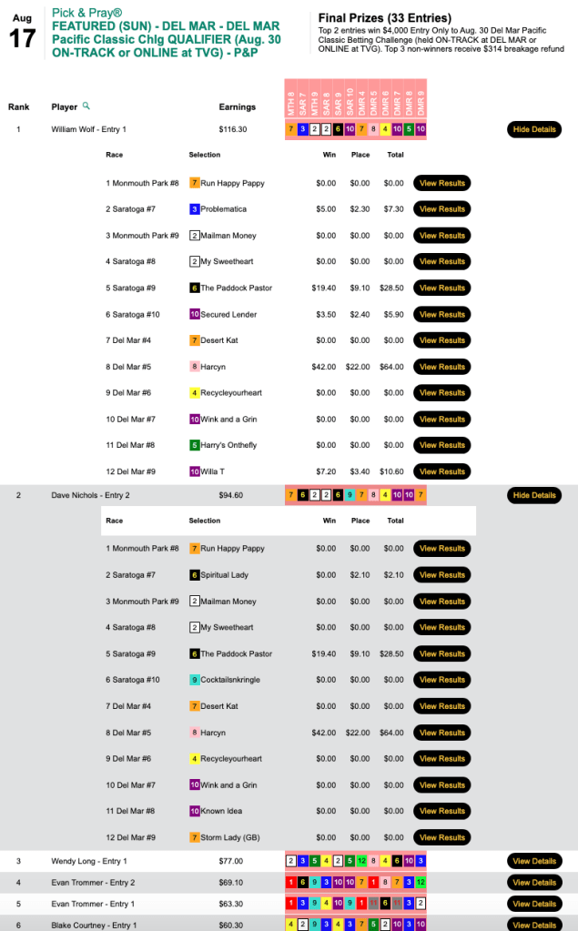 Using the same picks, Trommer also picked up a $4,000 seat in Saturday’s Del Mar Pacific Classic Challenge qualifier.