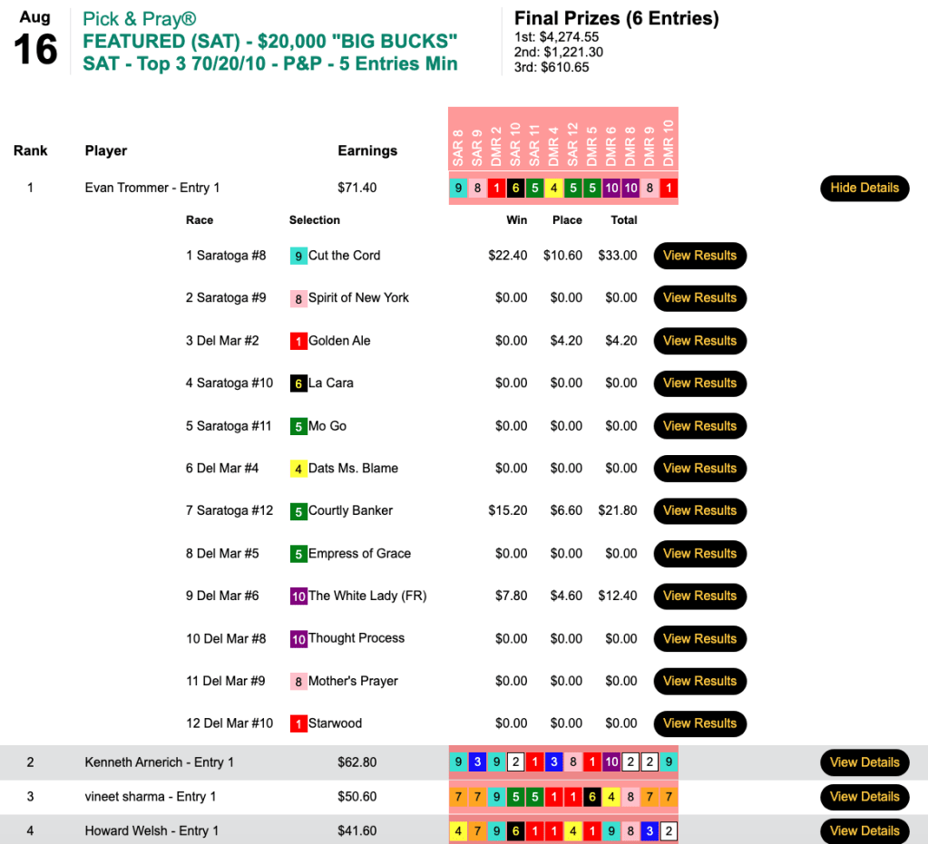 In Saturday’s $6,106 Big Bucks Pick & Pray, Trommer didn’t have Velocity, but he didn’t need her. Cut the Cord plus 2 other winners and 1 runner up were enough to get the job done and earn himself $4,274. In all, it was a $35,374 day for Trommer.