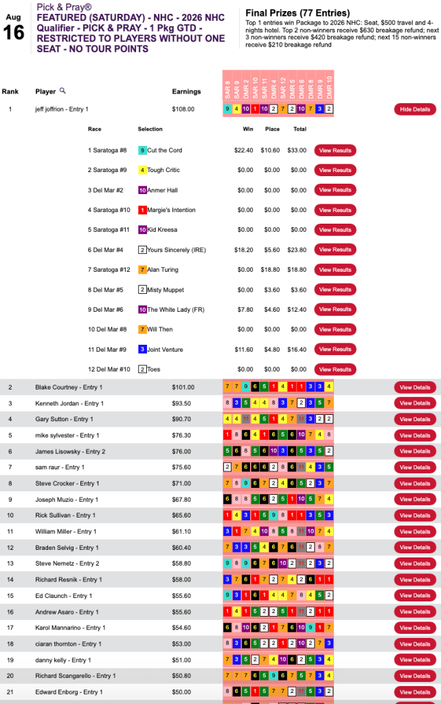 Joffrion (4 firsts, 2 seconds) got himself qualified at HorsePlayers in Saturday’s $210 NHC qualifier—an event restricted to those who had yet to land a 2026 seat.