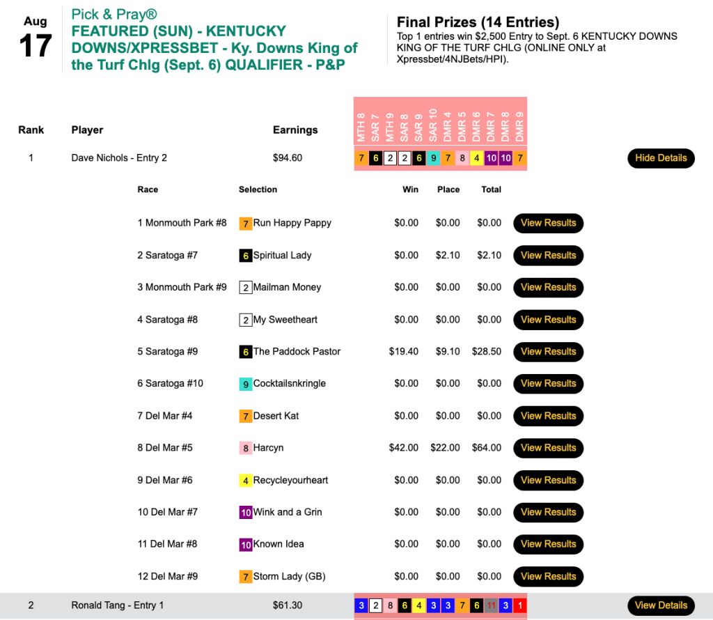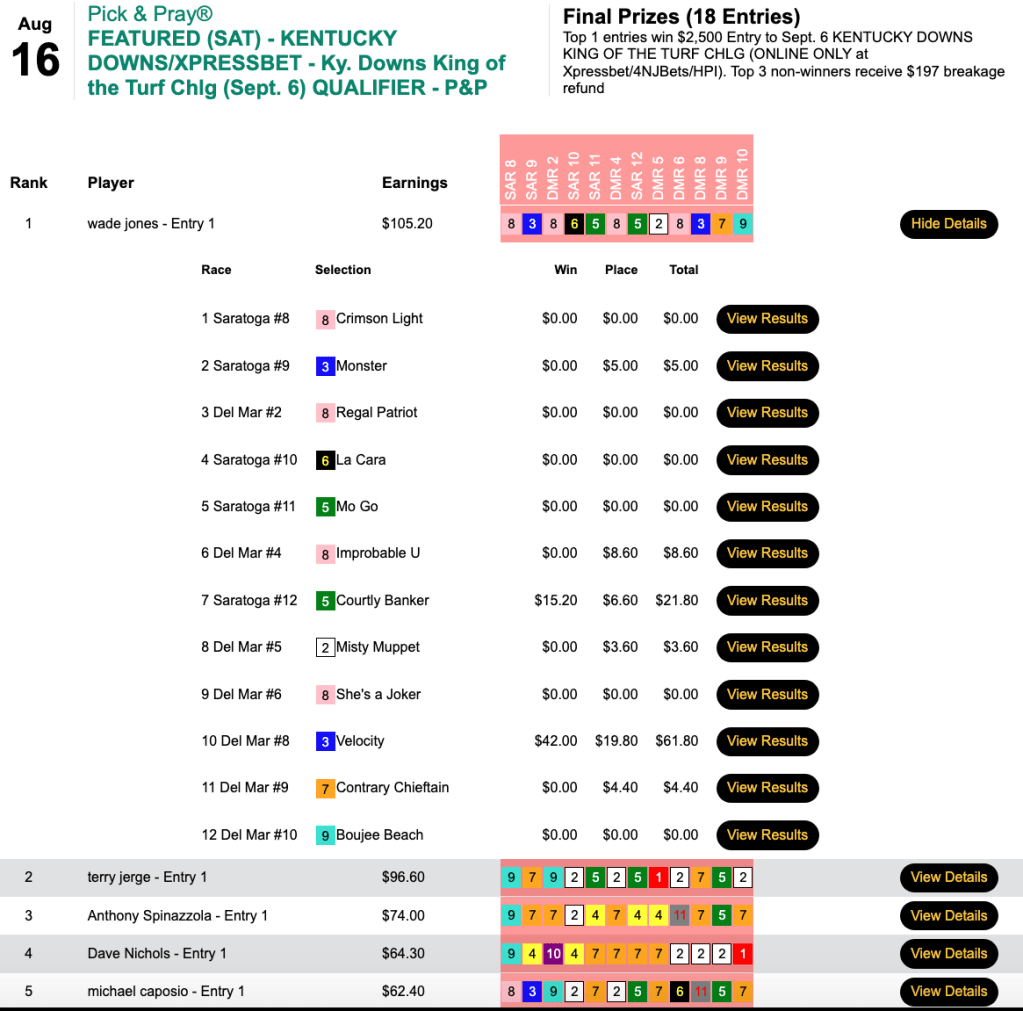We already mentioned that Nichols (2 wins, 1 place) snagged a Spa & Surf Showdown seat for running 5th behind Sean Nolan & co. No one did better than Nichols in Sunday’s Kentucky Downs King of the Turf Challenge qualifier, which had a $2,500 seat for September 6 up for grabs.