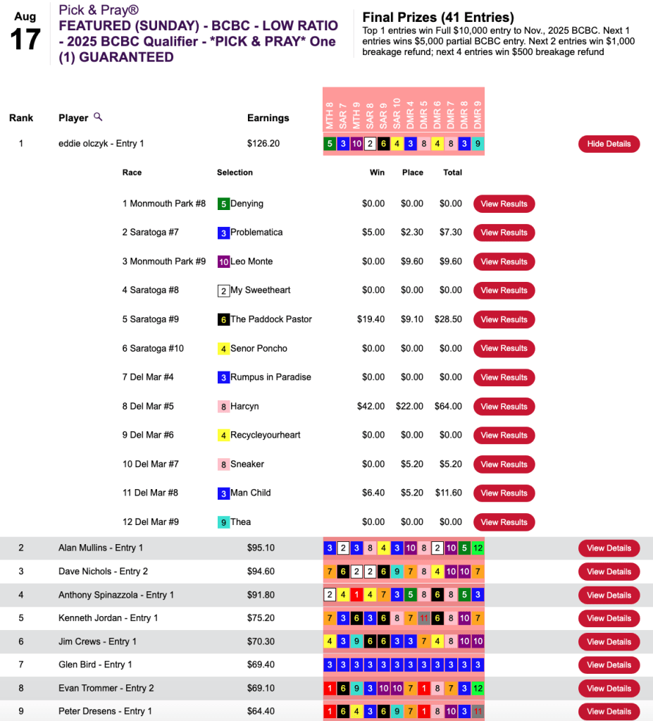 Austin Herzig recorded 3 wins and 1 place to take home the $2,000 seat in Sunday’s qualifier to the BC Pick & Pray Tourney. His heaviest lifter was The Paddock Pastor ($19.40, $9.10) in race 9 at Saratoga.