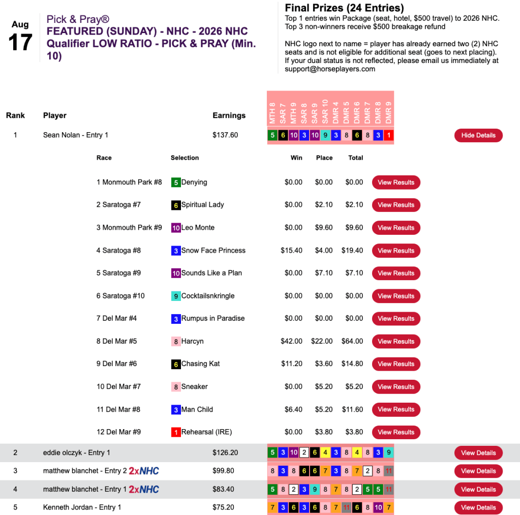 Nolan also won an NHC seat in Sunday’s Low Ratio qualifier at HorsePlayers. He edged out current horse racing/hockey commentator and past Stanley Cup champion/U.S. Olympian Eddie Olczyk for the victory.
