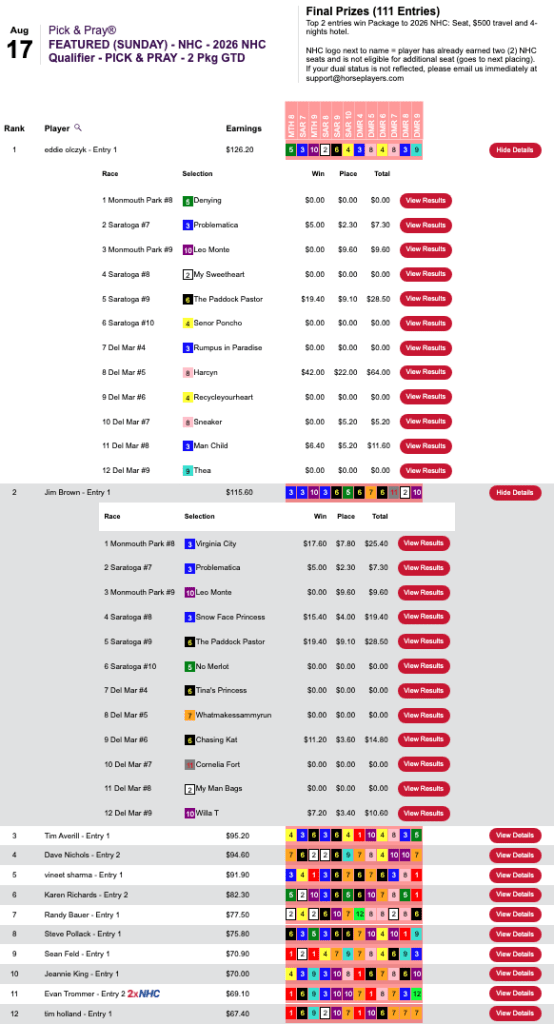 Olczyk tallied 4 winners (including his #1 star, Harcyn) and 2 helpers to light the lamp in this one. Also punching his ticket to Vegas here was the only other $100.00+ scorer, the fearsome Jim Brown, who plowed through the first 5 contest races—putting up 4 wins and a place—and tacked on two more winners thereafter. Brown’s top return came not with Harcyn but with The Paddock Pastor ($19.40, $9.10) in the 9th at Saratoga.