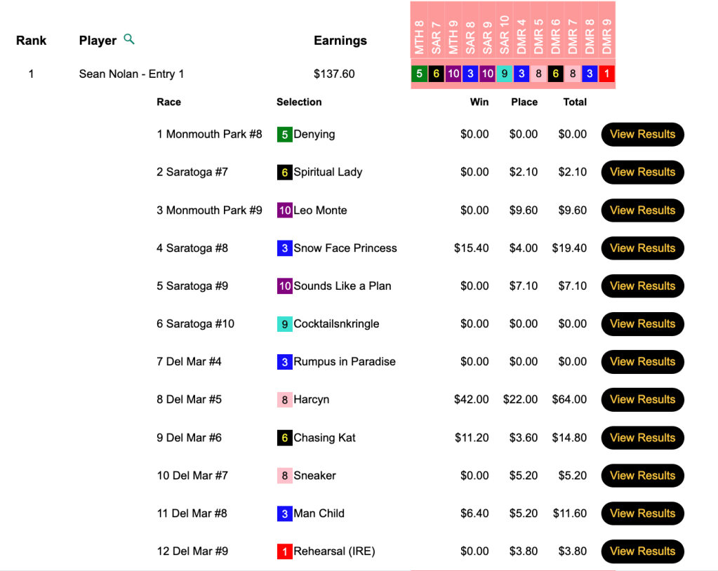Nichols chipped up with Ballyvaughan Gig ($28.00, $7.00) in the 5th at Del Mar plus one other winner and one runner up. He secured an $800 seat for this Saturday as did second-place finisher Vito Bucaria (3 wins, 4 places). Bucaria top hit came from Levitating ($14.00, $5.90) in the 8th at Saratoga.