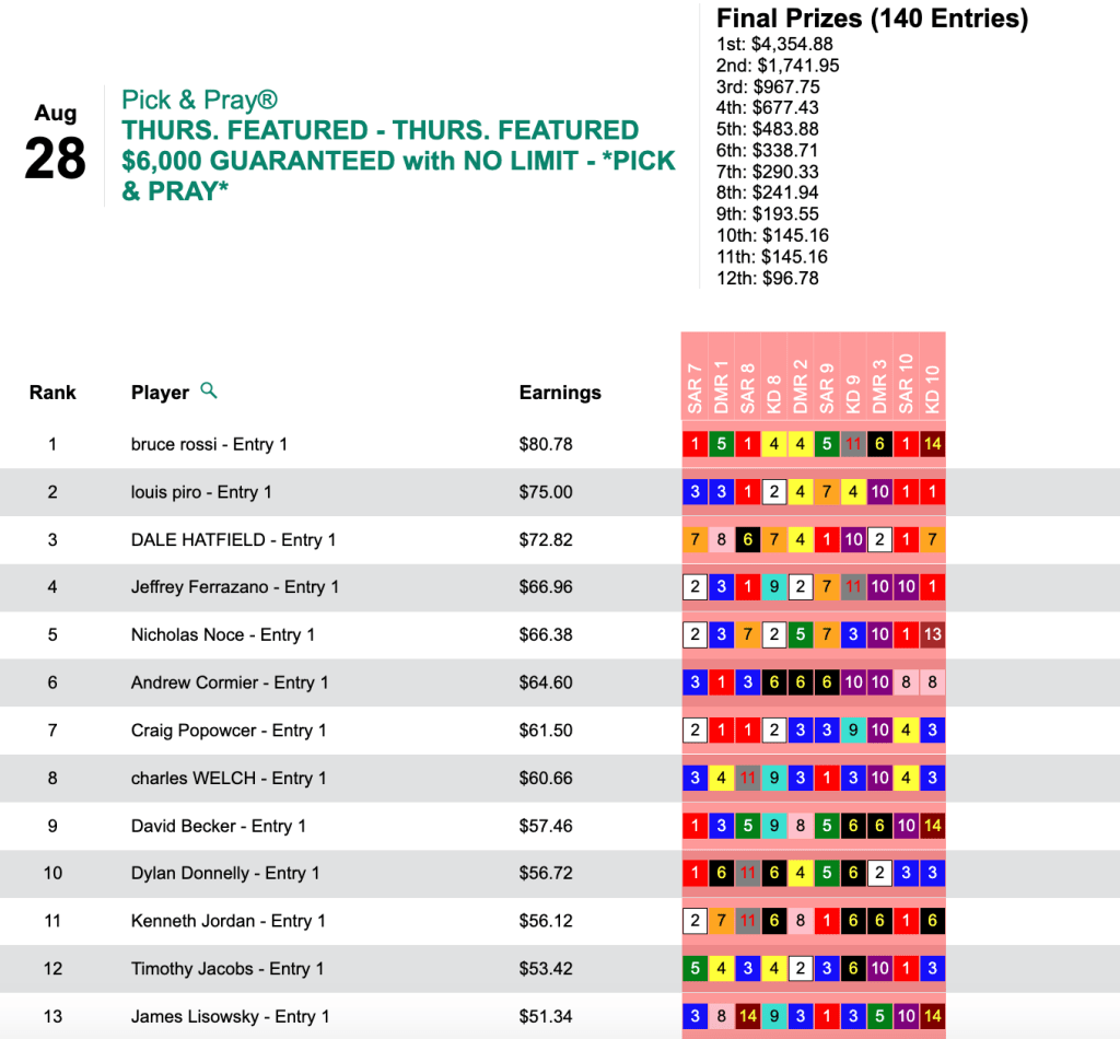 Same picks, same result—victory. This one was worth a $2,500 seat for this Saturday’s grassy competition.