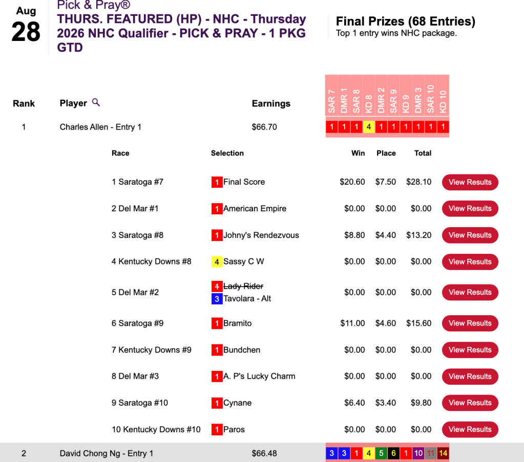 On Thursday, Charles Allen (4 winners) was the “one” in the $125 NHC qualifier at HorsePlayers.