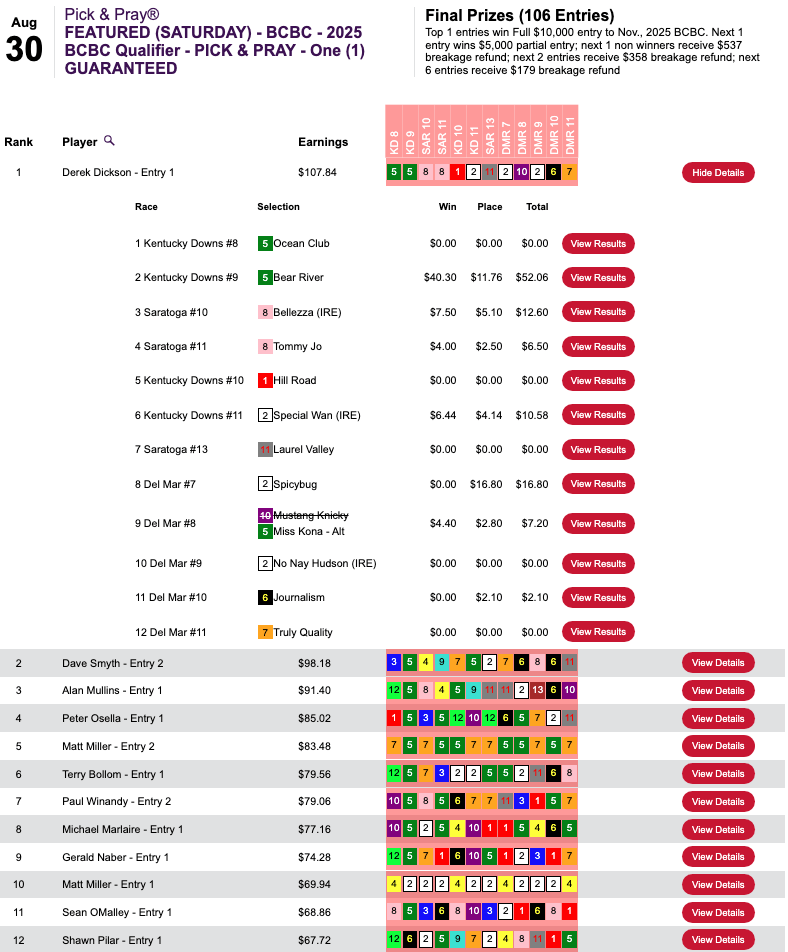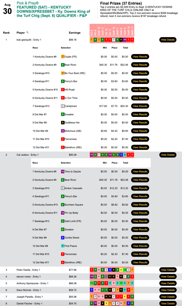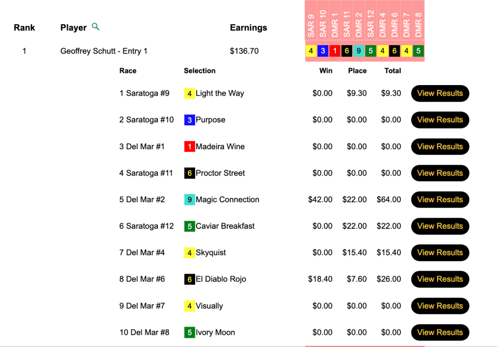 Schutt defeated all except Jeffrey Pesot, who tied him for first in this two-seat BC Pick & Pray Tourney qualifier. Ironically, the two had the same three collections, including longshot winners Going Deep ($85.60, $29.60) in the 7th at Del Mar and and Too Sassy ($52.20, $14.40) in race 10 at the picturesque southern California oval.