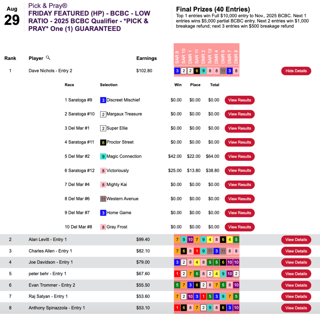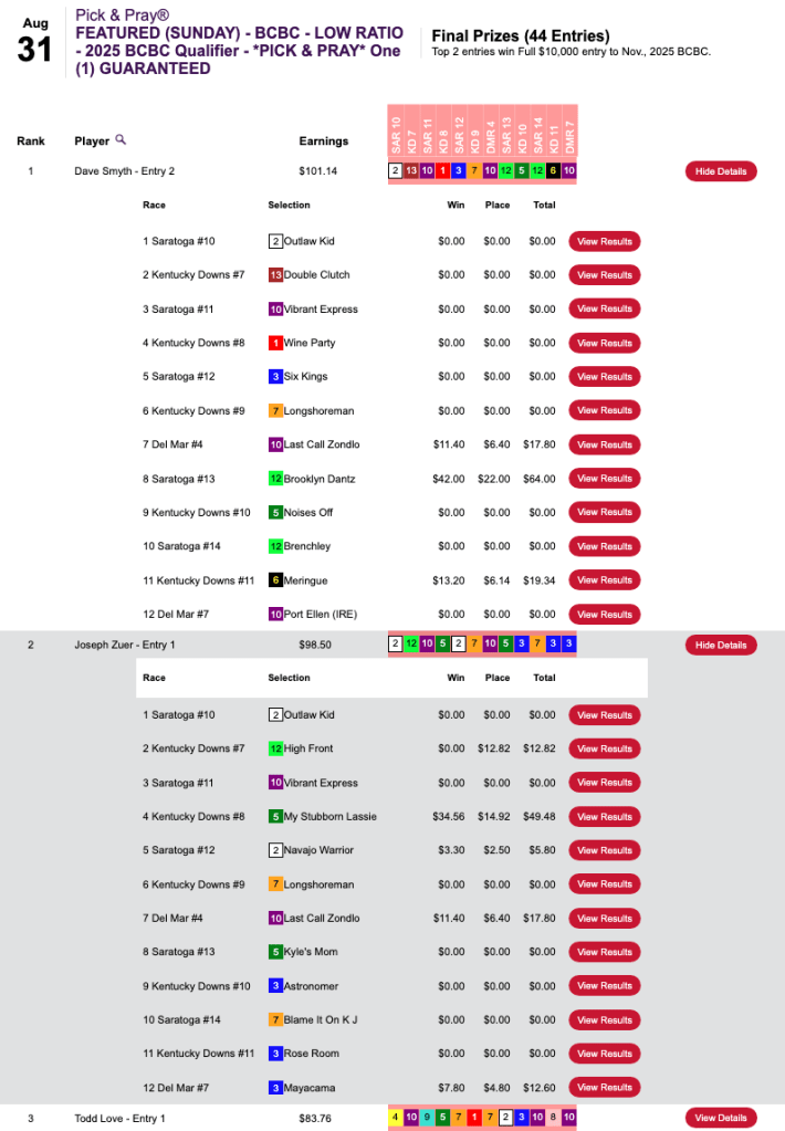 Hom and Somich took home the $2,000 berths in Friday’s qualifier to the inaugural BC Pick & Pray Tourney, a $300,000 Guaranteed contest here on Breeders’ Cup weekend. Somich got his seat by a scant 50 cents over Jeff Bussan.