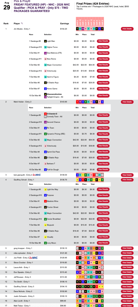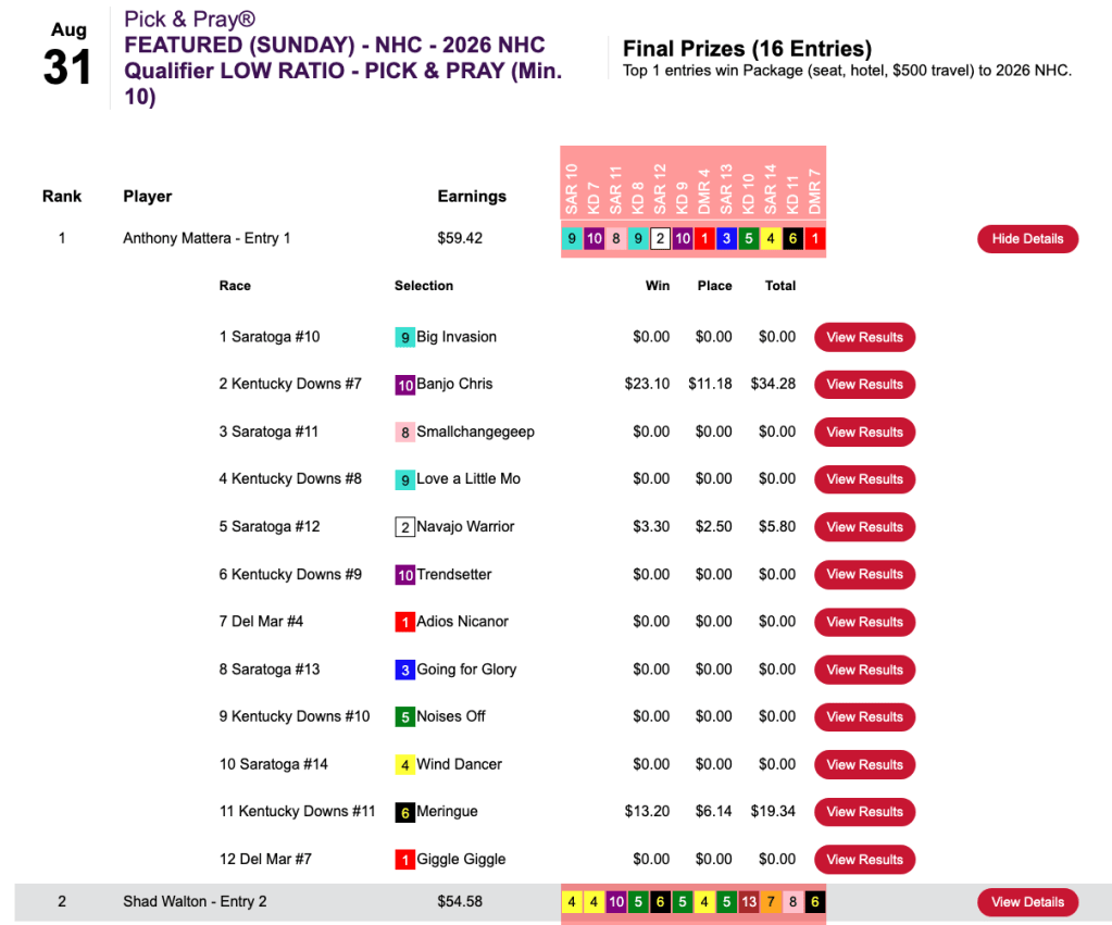 Schutt came in fourth in Friday’s $75 NHC qualifier, but there were enough entries for three berths to be awarded, and third-place finisher Bob Gianquitti was already double-qualified…so Geoffrey Schutt…come on down! Leading the way in this one was the day’s high scorer, NHC Hall of Famer Jim Meeks, who counted Magic Connection among his 5 firsts and 1 second. The runner-up was fellow Magic Connection fan Mark Heider (4W, 1P).