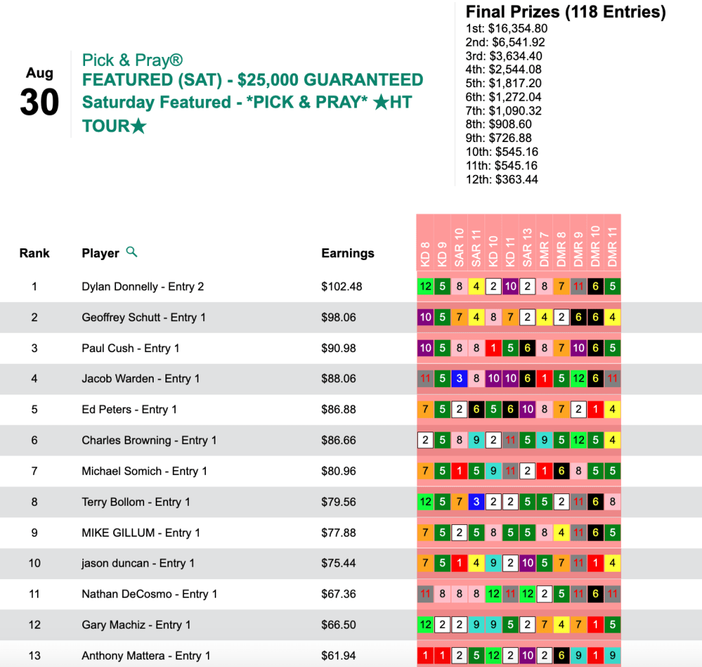Donnelly—in the top 10 of the HT Tour standings—will see his score improve further after taking our richest tourney of the week, Saturday’s $25,000 Gtd. Pick & Pray, which closed with a pot of $36,344. Donnelly’s share of that came to $16,354.