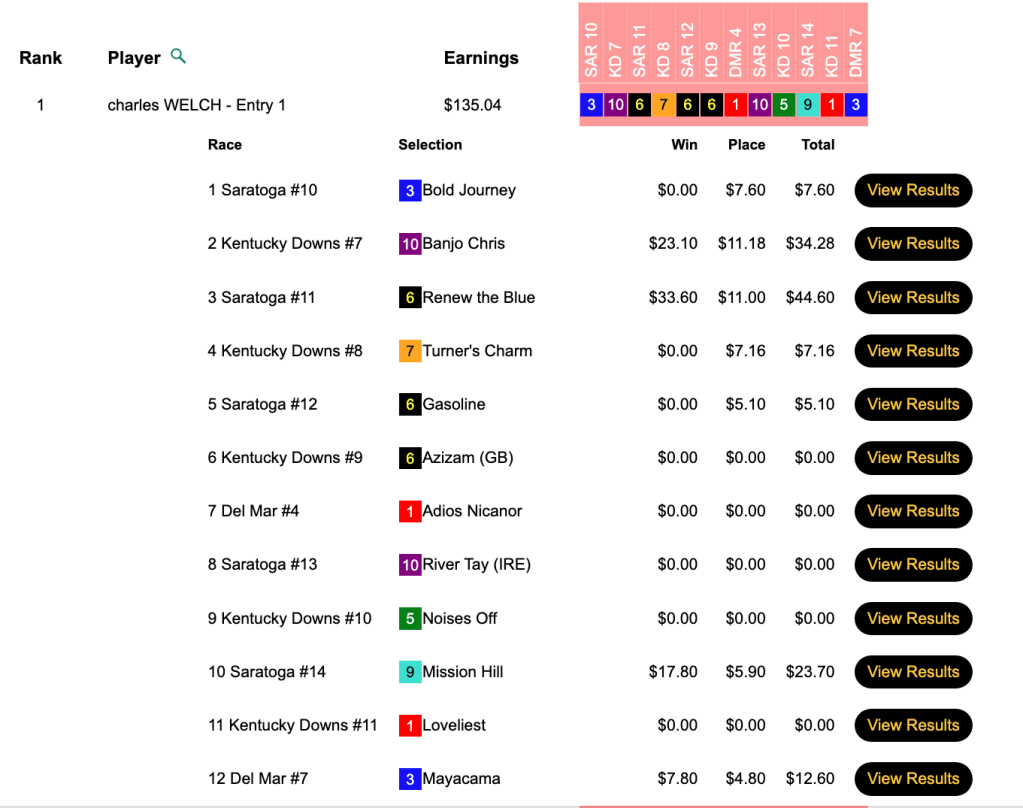 This time, in Saturday’s Keeneland Fall BCBC-NHC Challenge qualifier, Somich won by a full 5 dollars and change. He (2 firsts, 1 second) was one of the many successful Saturday players who smoked out Bear River at Kentucky Downs.