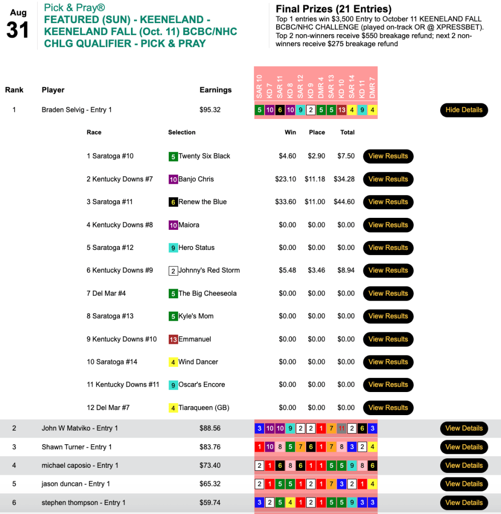 In order to capture Sunday’s $20,000 Gtd. Pick & Pray, however, Welch (4 firsts, 3 seconds) needed to hit a 5-2 winner in the tourney finale. He did so, and that’s how he bagged $14,371 in this HT Tour event that was ultimately worth a total of $31,937.