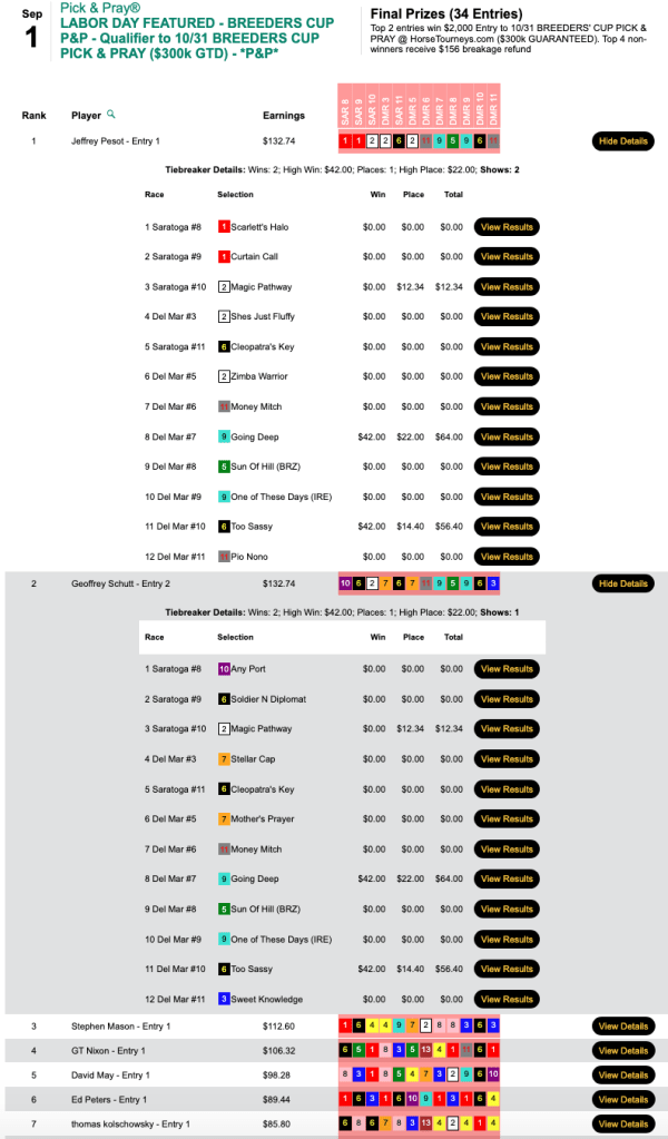 We noted earlier that Jeffrey Pesot picked up a $2,000 Breeders’ Cup Pick & Pray Tourney seat by tying for first with Geoffrey Schutt in the Labor Day qualifier to the $300,000 guaranteed battle. Pesot also won an NHC seat on Monday.