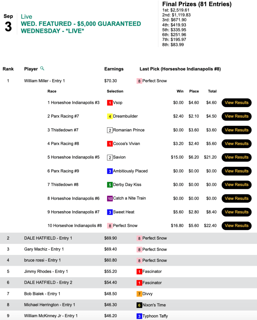 In the final contest race of Wednesday’s $5,000 guaranteed cash tourney, Miller (5 firsts, 2 seconds) scored with Perfect Snow ($16.80, $5.60) in the 8th at Horseshoe Indianapolis. That made it Miller Time—and he emerged with the $2,519 grand prize in a tourney that was ultimately worth a total of $5,599.