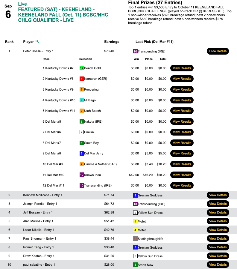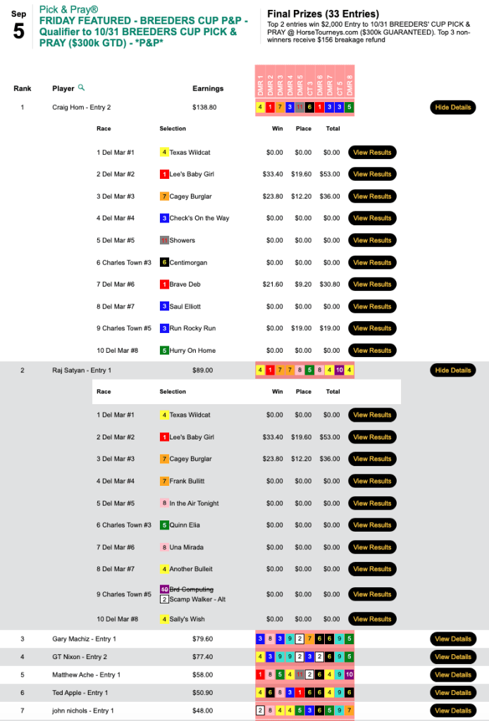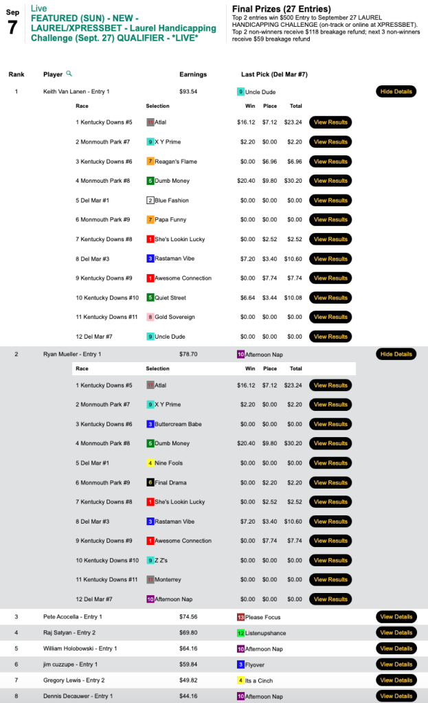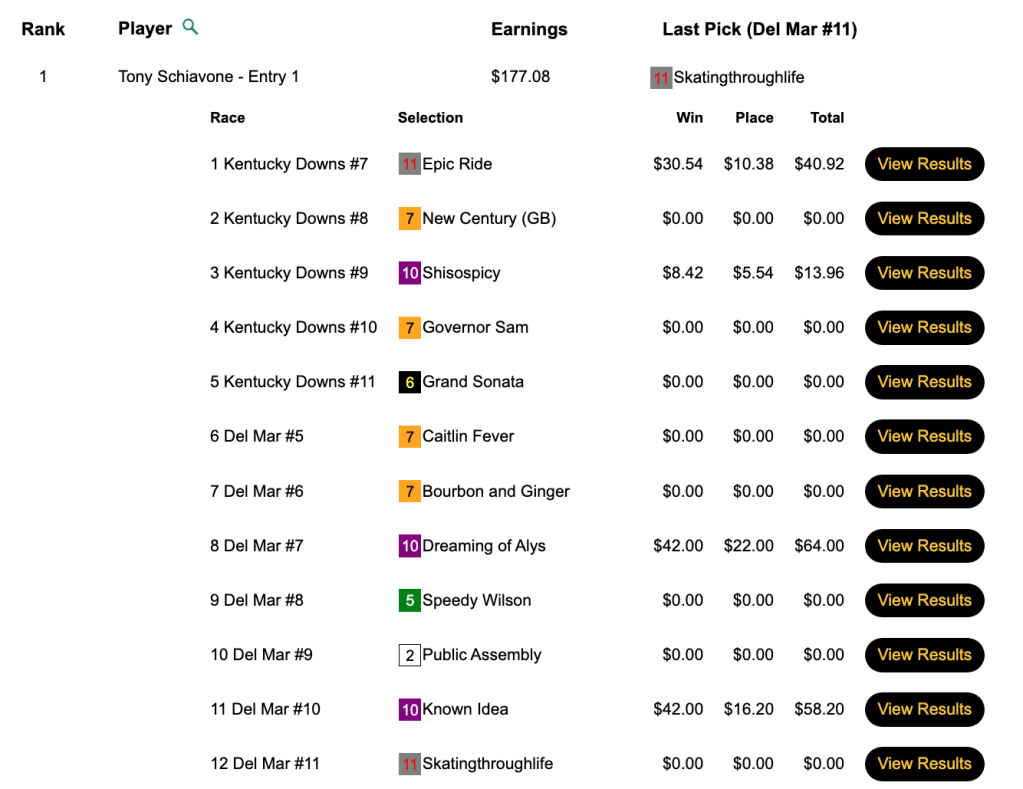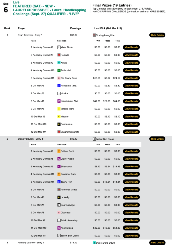 On Friday, Satyan came up with just two winners, but one of them was Lee’s Baby Girl in the 2nd at Del Mar. Satyan’s dynamic duo was enough to get himself the $500 seat in the day’s qualifier to the Autumn Handicapping Challenge on Sept. 27 at Laurel/Xpressbet.