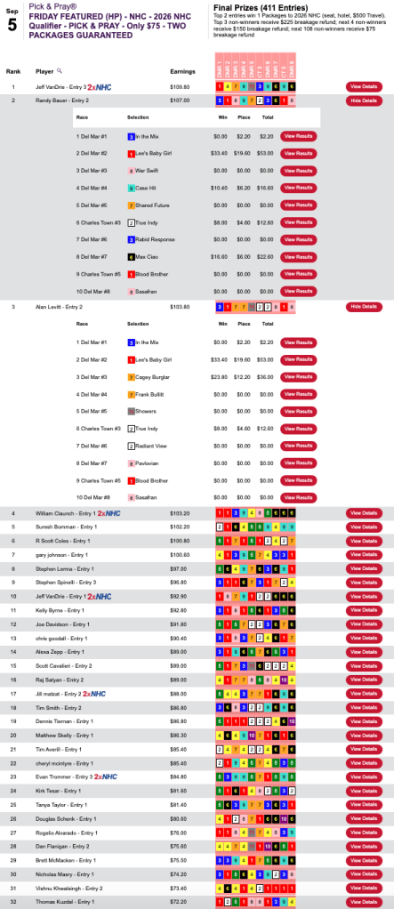 In Friday’s $75 NHC qualifier at HorsePlayers, first-place contestant Jeff VanDrie was already double-qualified. That left the two available Vegas packages to Randy Bauer (4 wins, 1 place) and 2021 Flo-Cal Faceoff champion Alan Levitt (3W, 1P).