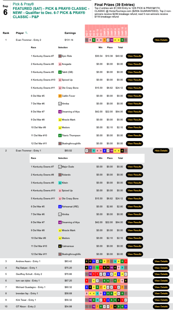 Trommer used the same picks to finish second in Saturday’s Pick & Pray Classic qualifier—and he used an even better set of 12 selections to finish first!