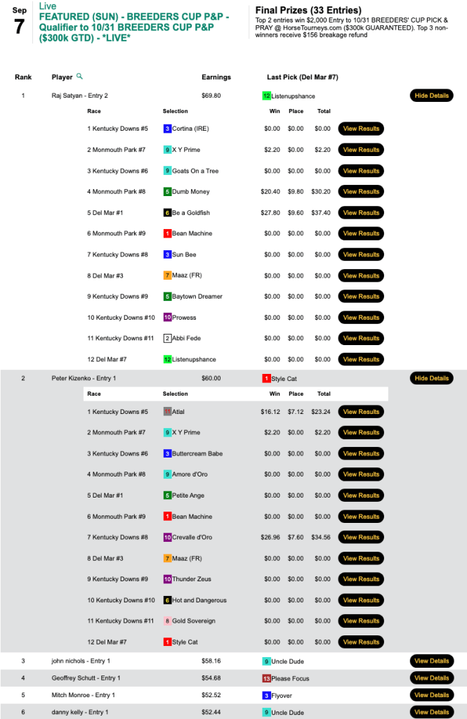 Undistracted by NFL football, Satyan put up 3 winners to collect his second BC Pick & Pray entry in 72 hours. His best pick was Be a Goldfish ($27.80, $9.60) in race 1 at Del Mar. Peter Kizenko also hit 3 winners—topped by Crevalle d’Oro ($26.96, $7.60) in the 8th at Kentucky Downs—and he picked up the other available $2,000 spot.