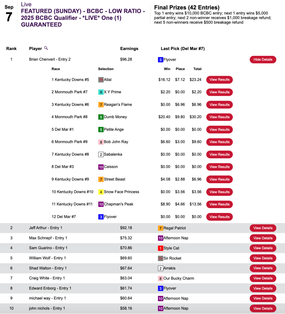 Chenvert got the seat to the (what else?) Breeders’ Cup Betting Challenge in Sunday’s Low Ratio qualifier at HorsePlayers. Jeff Arthur was the best of the rest, and he took home a $5,000 partial BCBC entry.