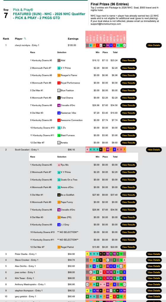 Cheryl McIntyre (4 wins, 5 places) and Scott Cavalieri (4W, 0P) each punched their tickets to Vegas in Sunday’s $165 NHC Pick & Pray here at HorseTourneys.