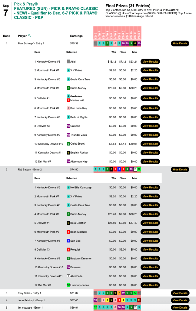 Satyan added $5.00 to his scoring total and a $1,500 seat to his contest portfolio in Sunday’s qualifier to the Dec. 6-7 Pick & Pray Classic—the final leg of the 2025 HT Champions Series.