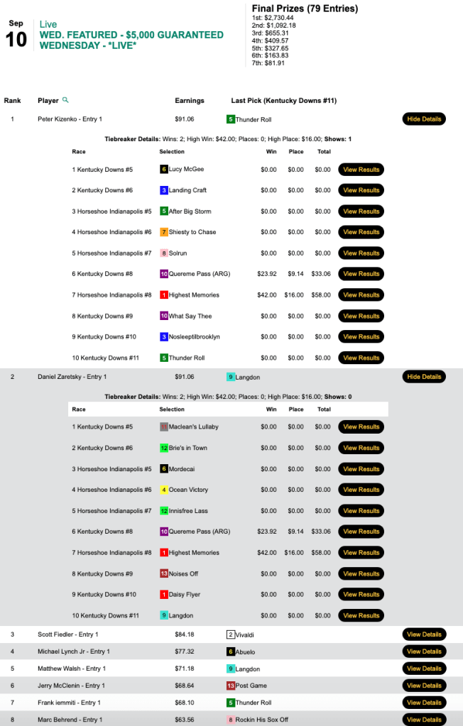 Peter Kizenko and Daniel Zaretsky each smoked out the same two pricy winners—and nothing else. That meant a tiebreaker would be required to determine the outcome of Wednesday’s $5,000 guaranteed cash game, which had a prize pool of $5,460. It came down to show horses. Kizenko had one…Zaretsky had none…and so Kizenko pocketed the winner’s share of $2,730 while Zaretsky had to settle for $1,092.