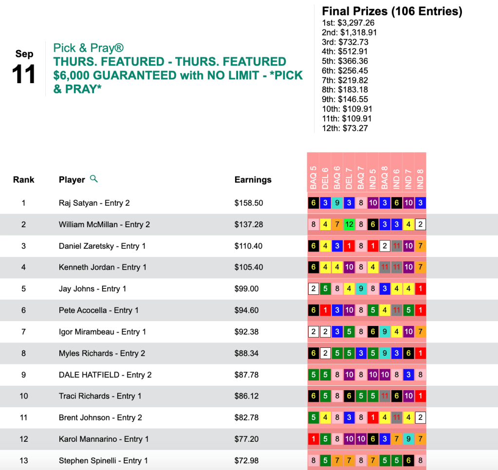 On Sunday, the five biggest win prices among the 12 featured-tourney races were $13.42, $17.00, $17.20, $18.40 and $19.60. With that range being so narrow, it meant there were countless pathways to success. It also contributed to the fact that the 13 Sunday grand prizes on offer went to 13 different people.