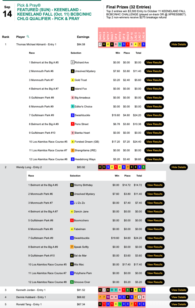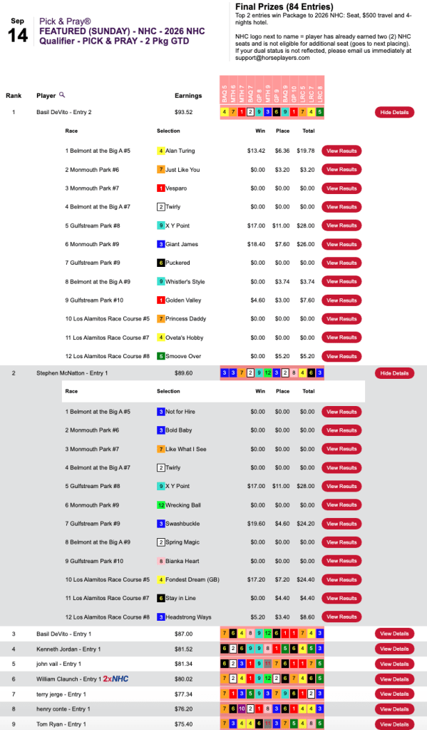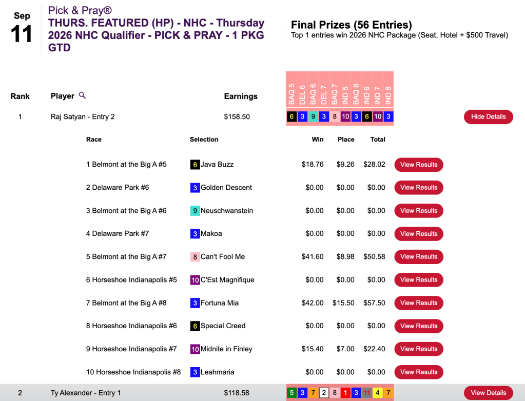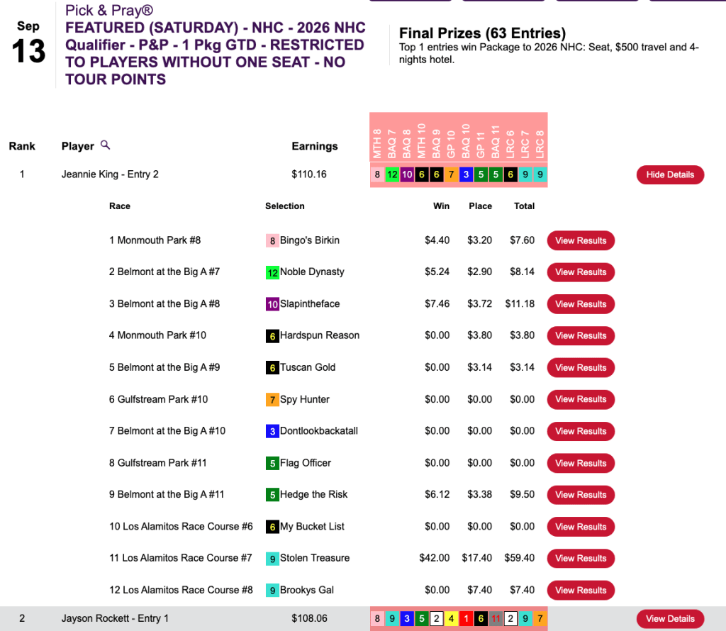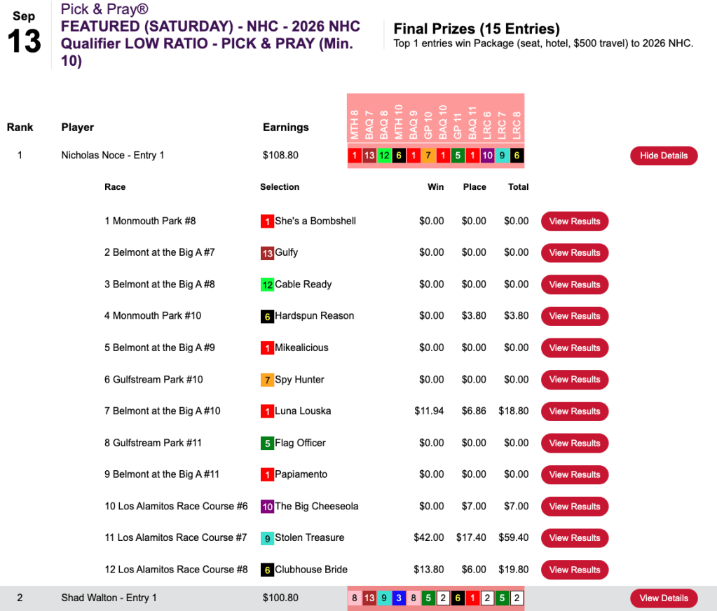Saturday’s NHC Low Ratio qualifier at HorsePlayers was open to all.