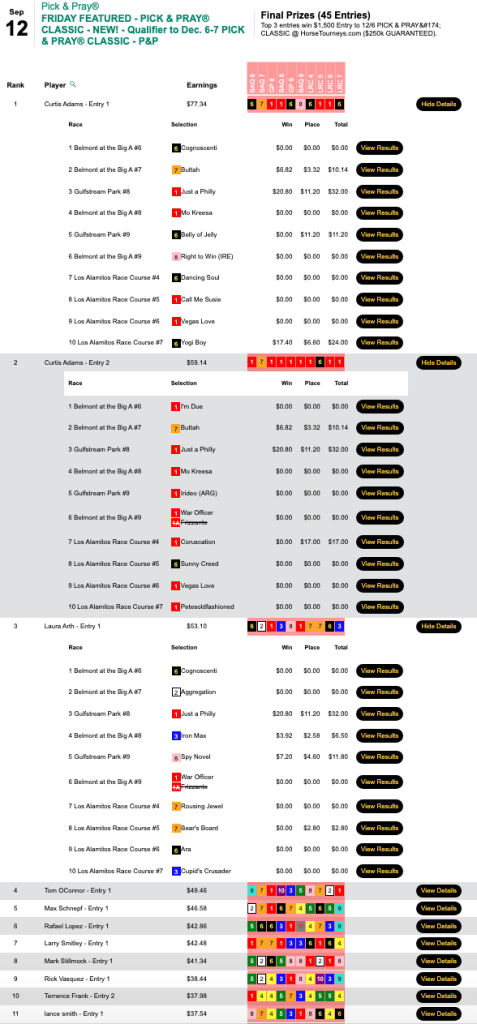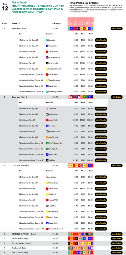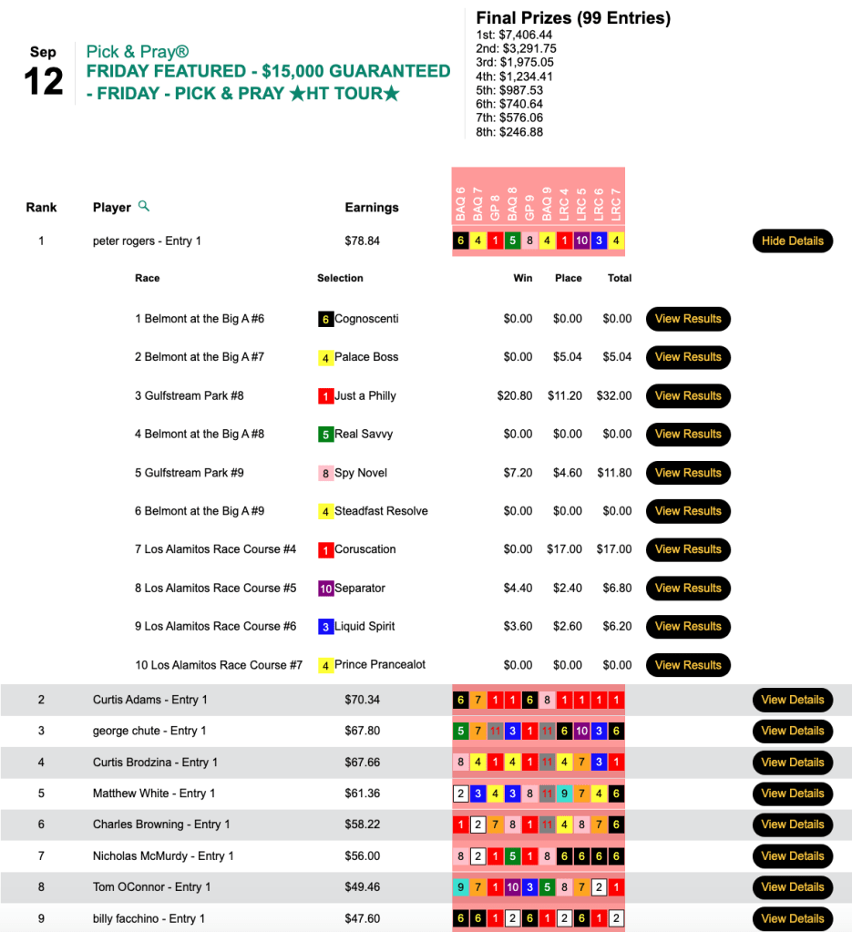 Hopping back to Friday action, Peter Rogers put up 4 firsts and 2 seconds to take the day’s HT Tour battle, our $15,000 Gtd. Pick & Pray.