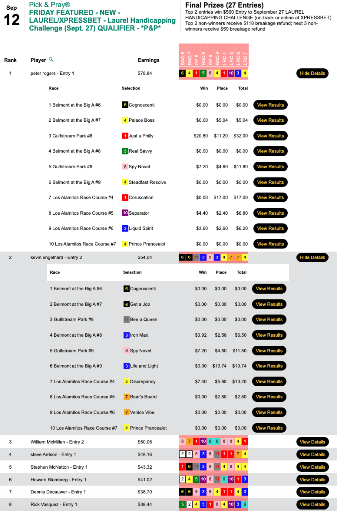 Joining Rogers in the field for the September 27 hybrid get-together at Laurel Park/Xpressbet will be second-place finisher Kevin Engelhard, whose top return among 3 wins and 2 places was a $19.74 place collection on Life and Light, the 26-1 runner up in race 9 at BAQ.