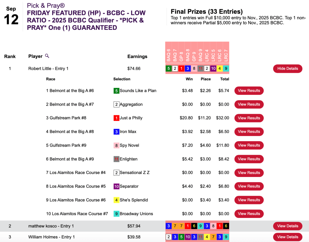 Little corralled the $10,000 seat in Friday’s Breeders’ Cup Betting Challenge Low Ratio qualifier at HorsePlayers. Matthew Kosco reported home in second place—which was good for a $5,000 partial BCBC entry.