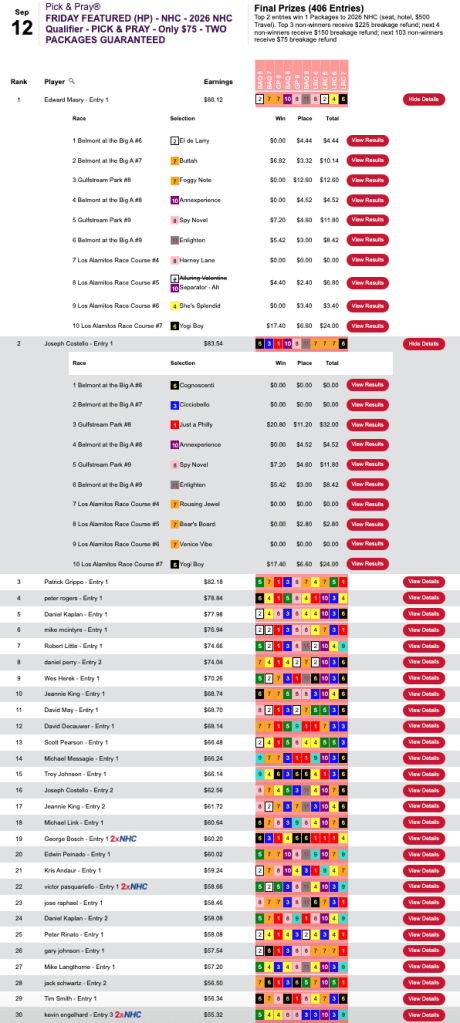 On Friday, Costello used Just a Philly ($20.80, $11.20) in the 8th at Gulfstream and Yogi Boy ($17.40, $6.60) in the 7th at Los Alamitos as the foundation of a 4-win, 2-place day that got him second place behind Edward Masry in the day’s $75, two-seat NHC qualifier at HorsePlayers.