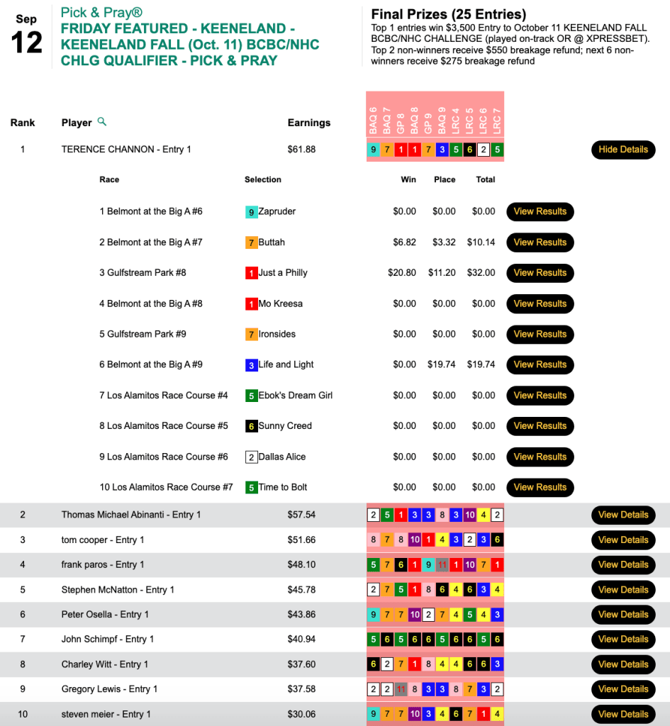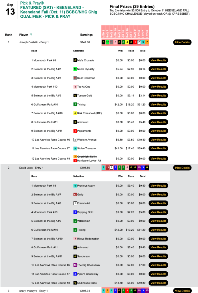 It came in Saturday’s Keeneland Fall BCBC-NHC Challenge qualifier where Costello led the way on the strength of 4 wins and 2 places. The 6 collections included a pair of $46 horses—Ticking ($46.40, $19.20) in the 10th at Gulfstream and Stolen Treasure ($46.60, $17.40) in race 7 at Los Al. It was $39.08 back to second-place finisher David Lupo (3W, 3P), who also picked up a $3,500 Keeneland spot.