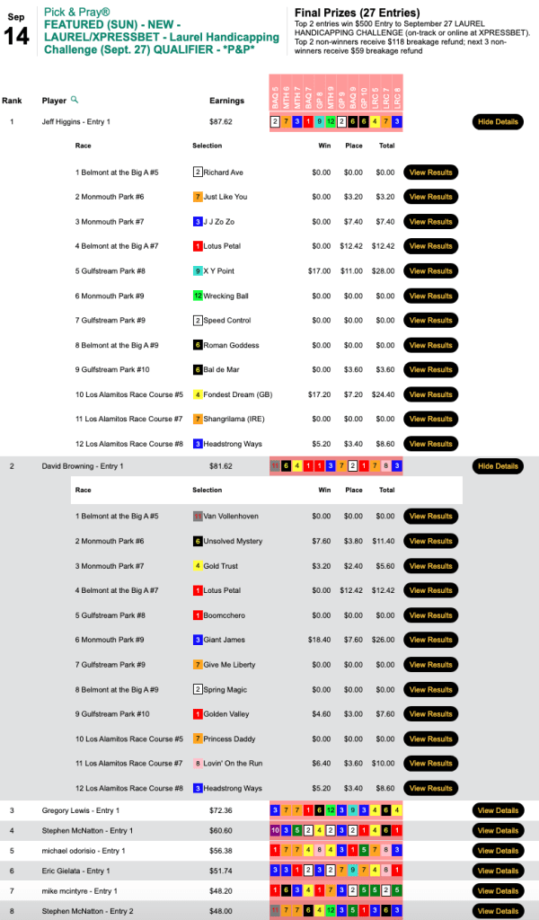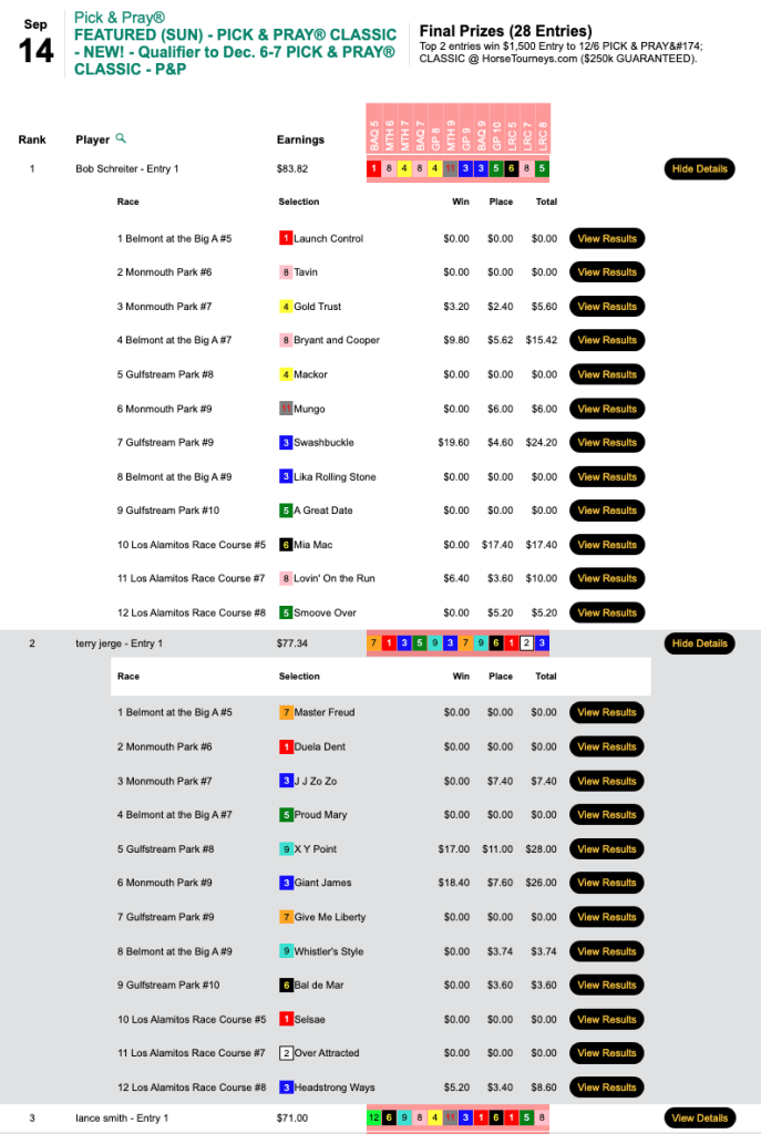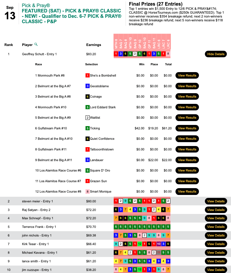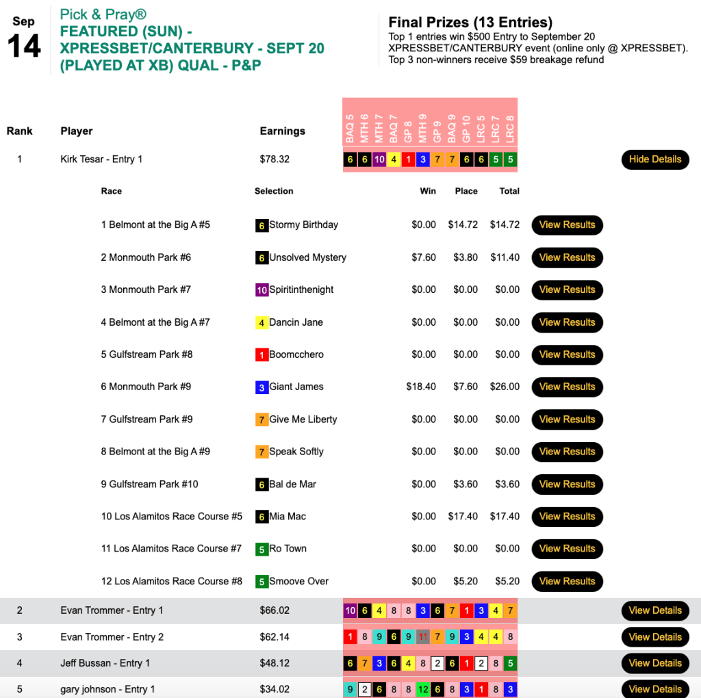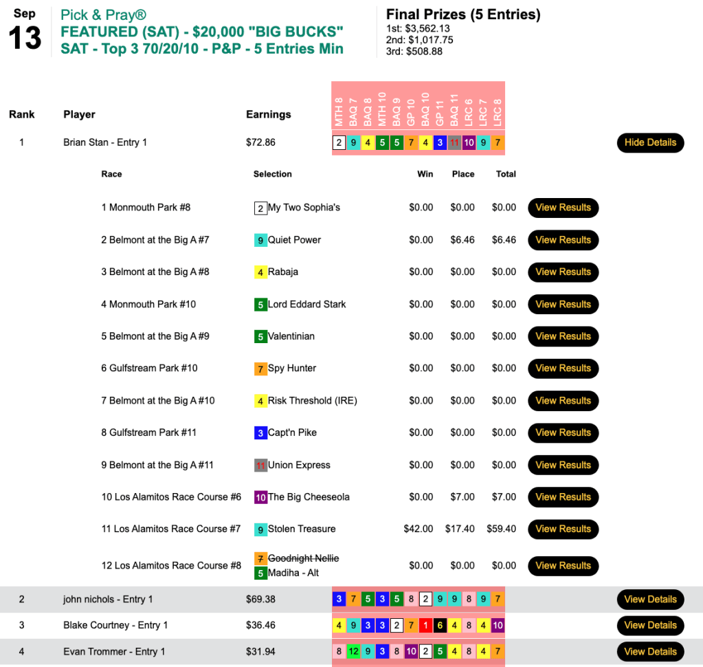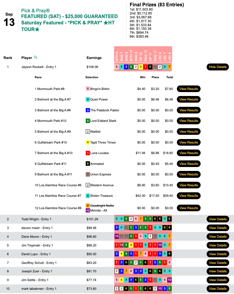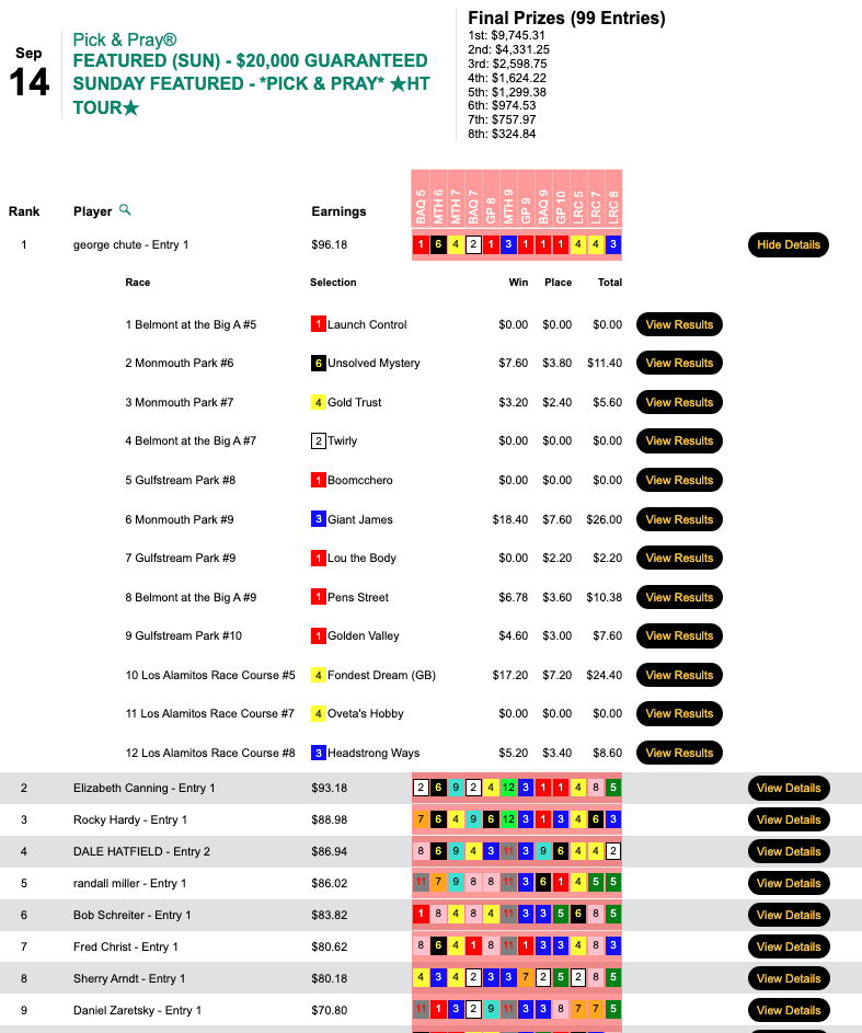 One of them went to George Chute who posted 7 wins and 1 place in Sunday’s $20,000 Gtd. Pick & Pray. Chute pocketed $9,745 in an HT Tour event that closed with a final pot of $21,656. His best pick was Giant James ($18.40, $7.60) in the 9th at Monmouth.