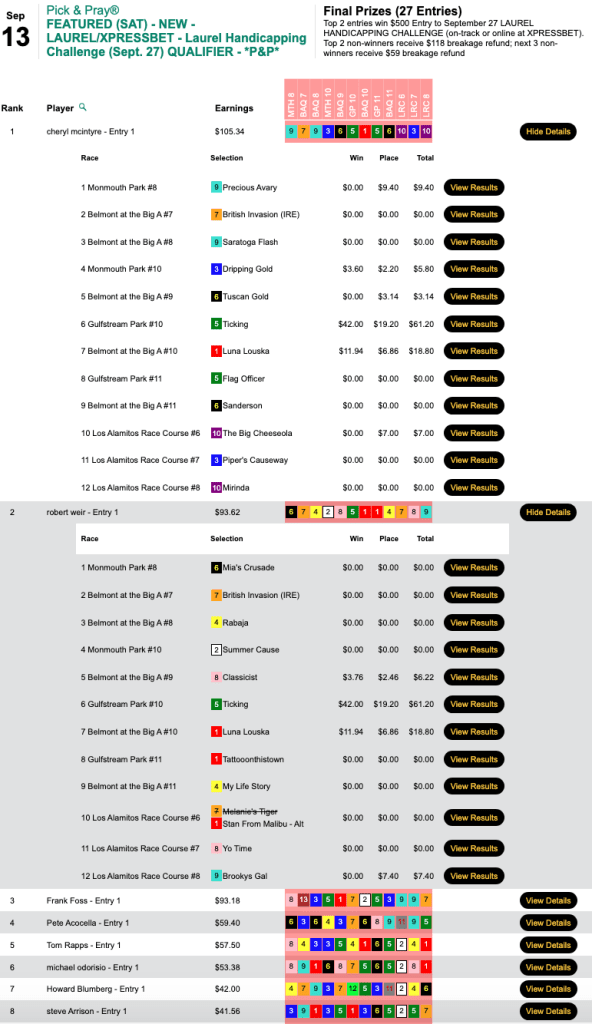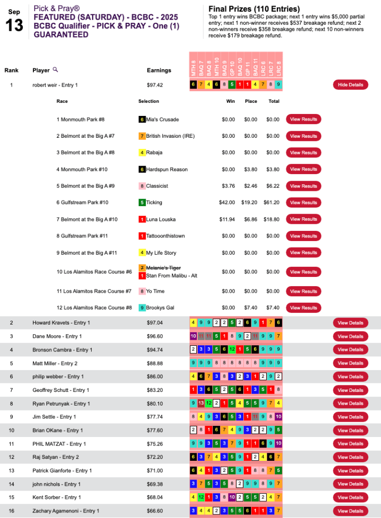 Thanks to an additional place collection, Weir improved his score slightly in Saturday’s $179 Breeders’ Cup Betting Challenge qualifier at HorsePlayers.