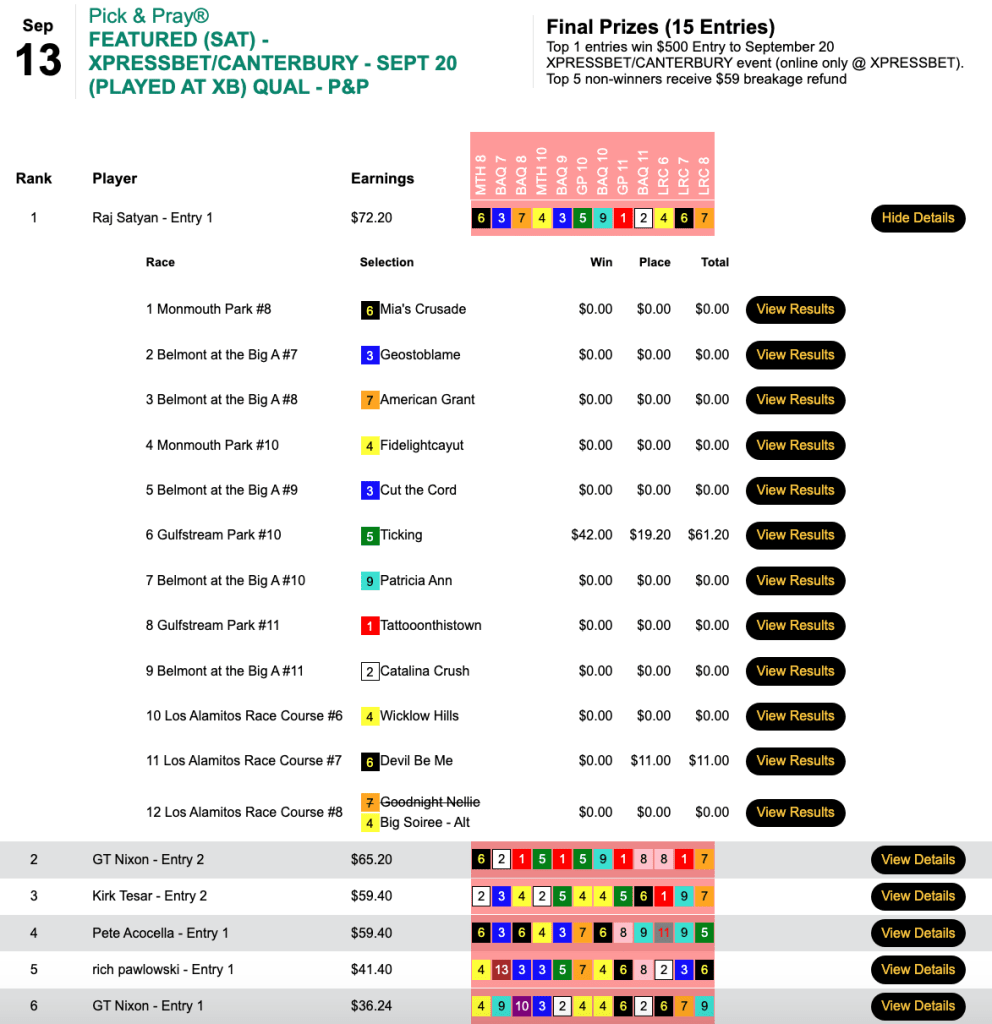 Satyan wasn’t done for the week. On Saturday, he captured our first qualifier to the September 20 Canterbury/Xpressbet NHC qualifier.