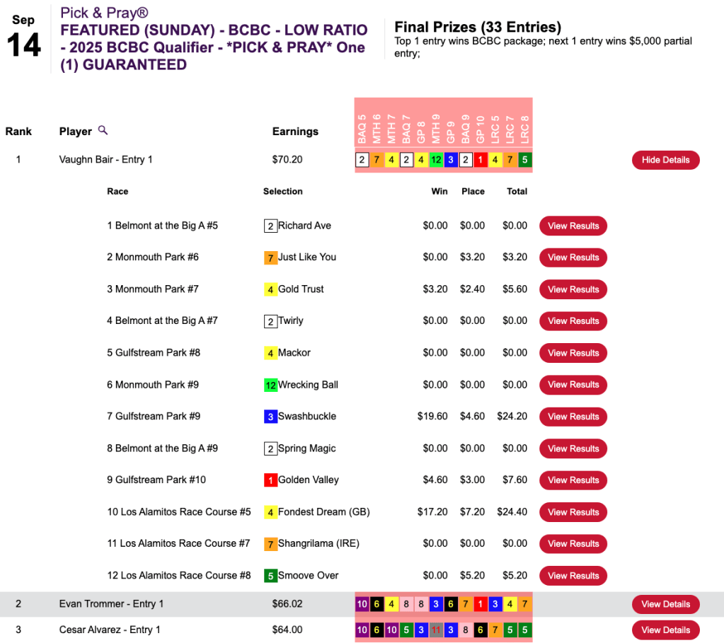 Bair picked up the $10,000 gift certificate in Sunday’s Breeders’ Cup Betting Challenge Low Ratio qualifier. A $5,000 partial BCBC entry went to second-place finisher Evan Trommer.