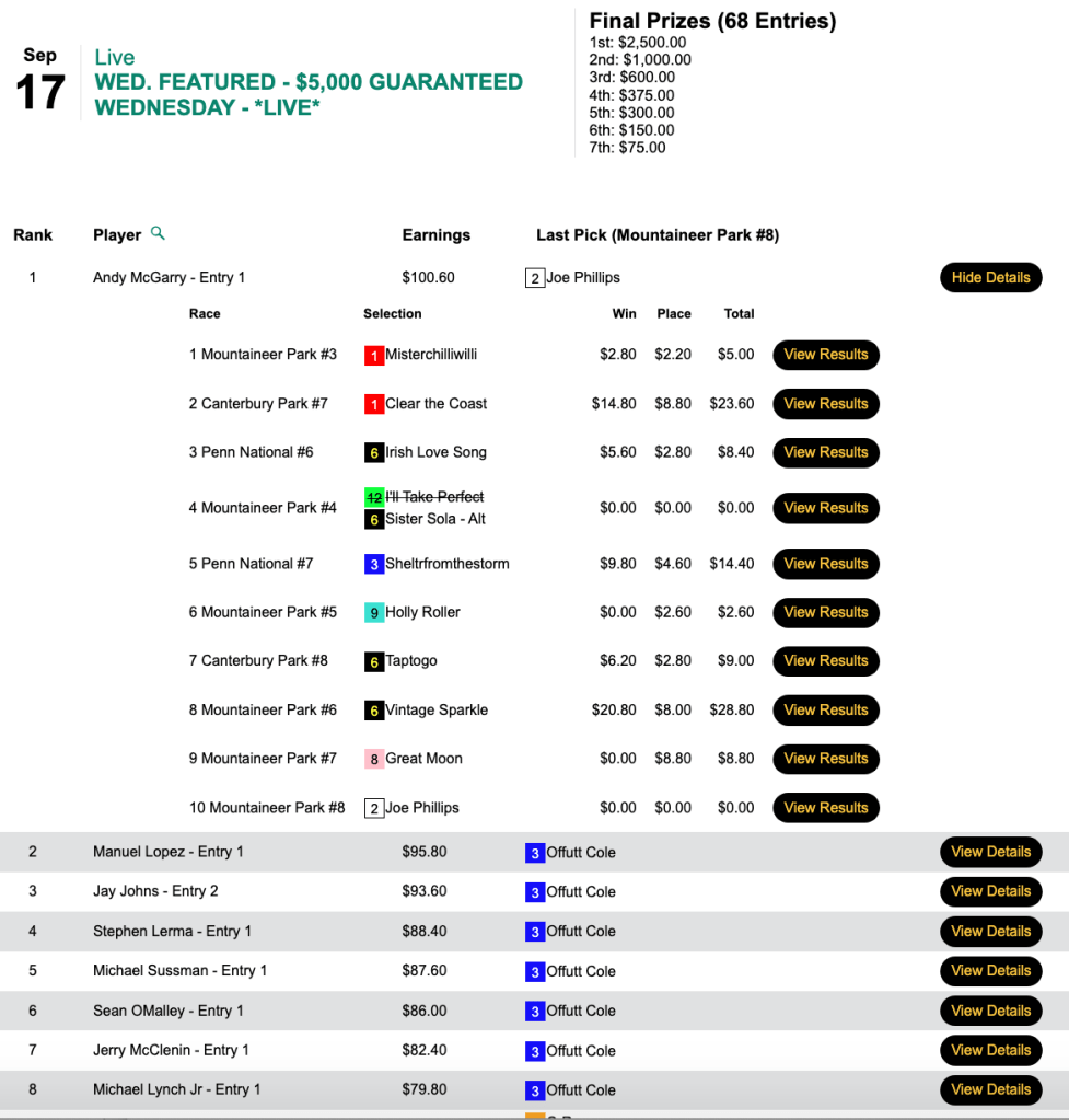 Brownfield smoked out both of the day’s bombs—Mad House and Keep Dancin Nick. To that dynamic duo, he added a pair of place collections en route to a final score of $118.80 and a Vegas package. Also earning a spot in the big dance next March was runner up Wes Herek, whose heaviest lifter among 4 wins and 3 places was Mad House at Parx.