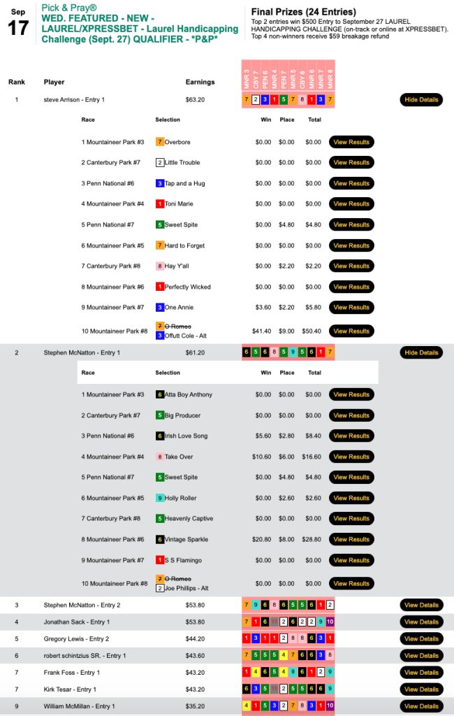 Arrison had the 7 horse, O Romeo, in the West Virginia nightcap. That one dumped his rider in the post parade and ran around for a very long time before being scratched. (It looked like the horse wasn’t so much corralled as just exhausted—from running around by himself for so long. Mountaineer needs some faster ponies for their outriders!) Anyway…Arrison (2 wins, 2 places) also got moved onto backup pick Offutt Cole, and that shot him to the top in Wednesday’s qualifier to this Saturday’s Autumn Handicapping Challenge at Laurel/Xpressbet. Stephen McNatton (2W, 3P) finished a close second, and he received the other available $500 seat. McNatton’s top return came with Vintage Sparkle ($20.80, $8.00) in race 6 at Mountaineer.