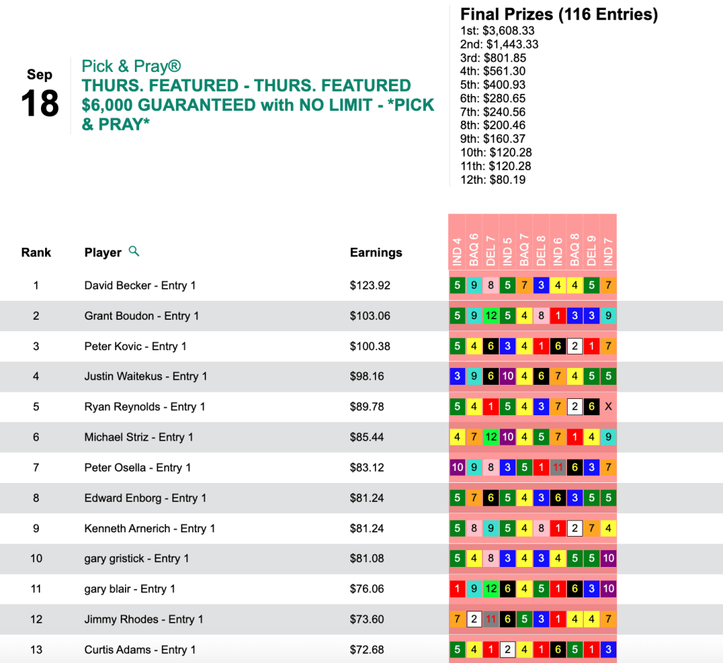 Thursday’s cash-game hero was David Becker, who picked 6 winners.