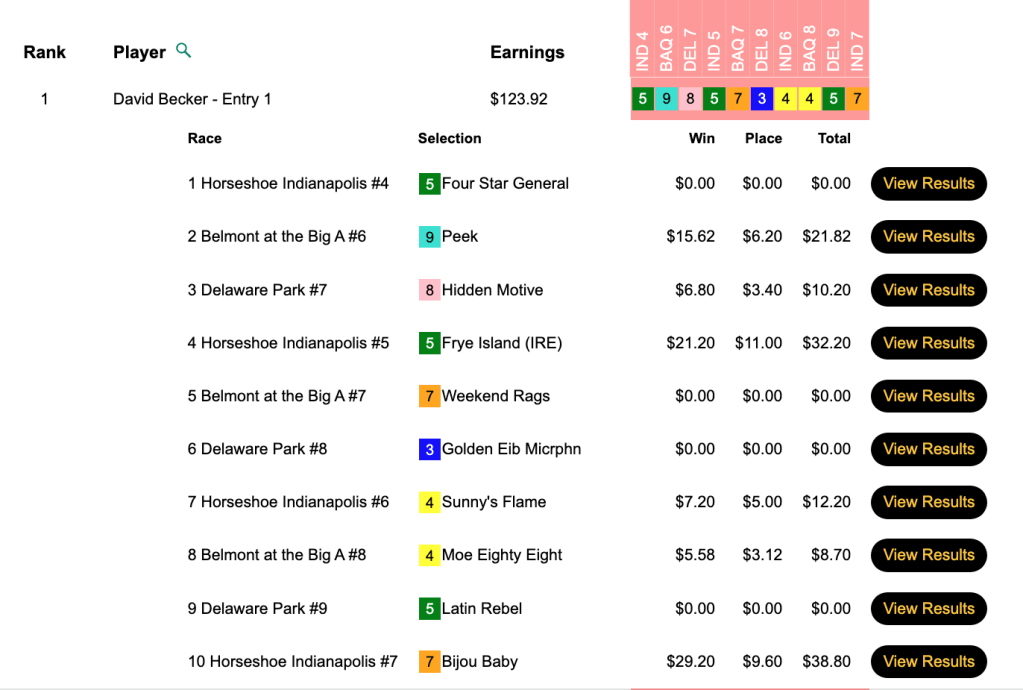 The best of Becker’s half dozen came at the end. He nailed Bijou Baby ($29.20, $9.60) in the 7th at Horseshoe Indianapolis. Becker earned $3,608 in Thursday’s $6,000 Gtd. Pick & Pray, which closed with a final purse of $8,018.