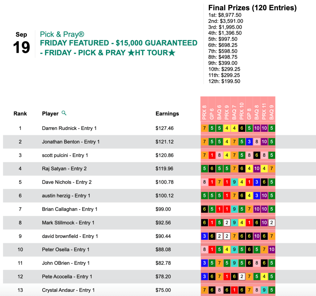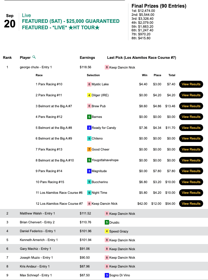 Chute laddered his way to the top of Saturday’s $25,000 Guaranteed cash game by connecting on Keep Dancin Nick at the end. His 6 wins and 2 places in this HT Tour battle were rewarded with $12,474 in a game that was ultimately worth a total of $27,720.