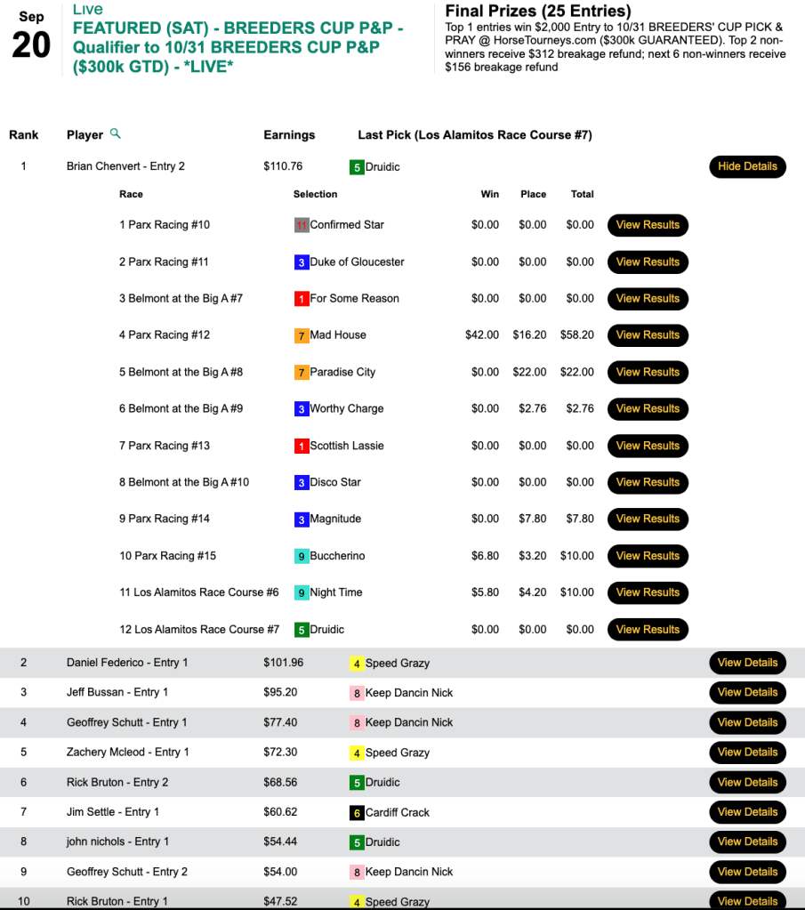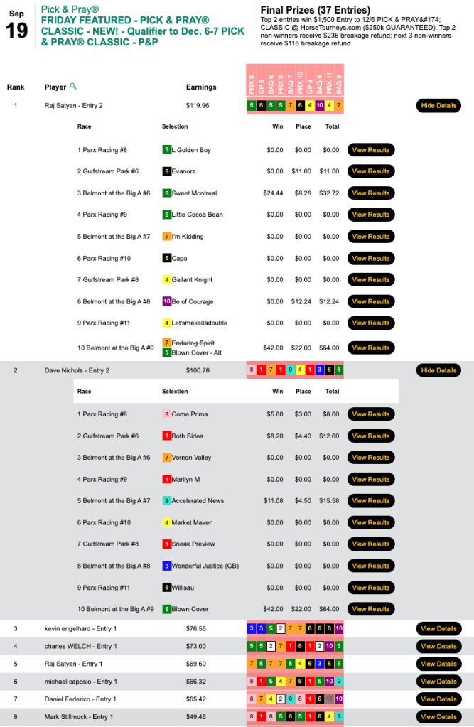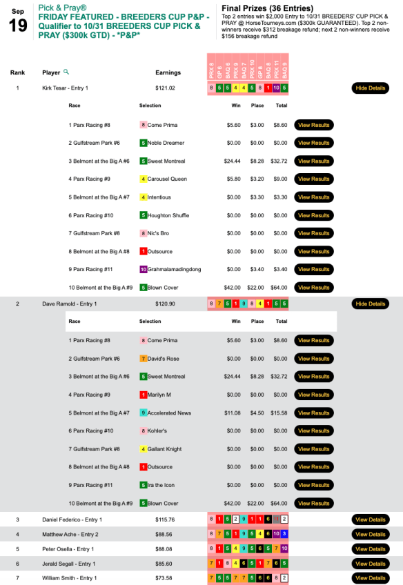 Nichols captured Friday’s Breeders’ Cup Betting Challenge Low Ratio Pick & Pray at HorsePlayers. Charles Welch reported home in second position, and he picked up a $5,000 partial BCBC entry. Look for Welch, perhaps, in a future BCBC partial qualifier!